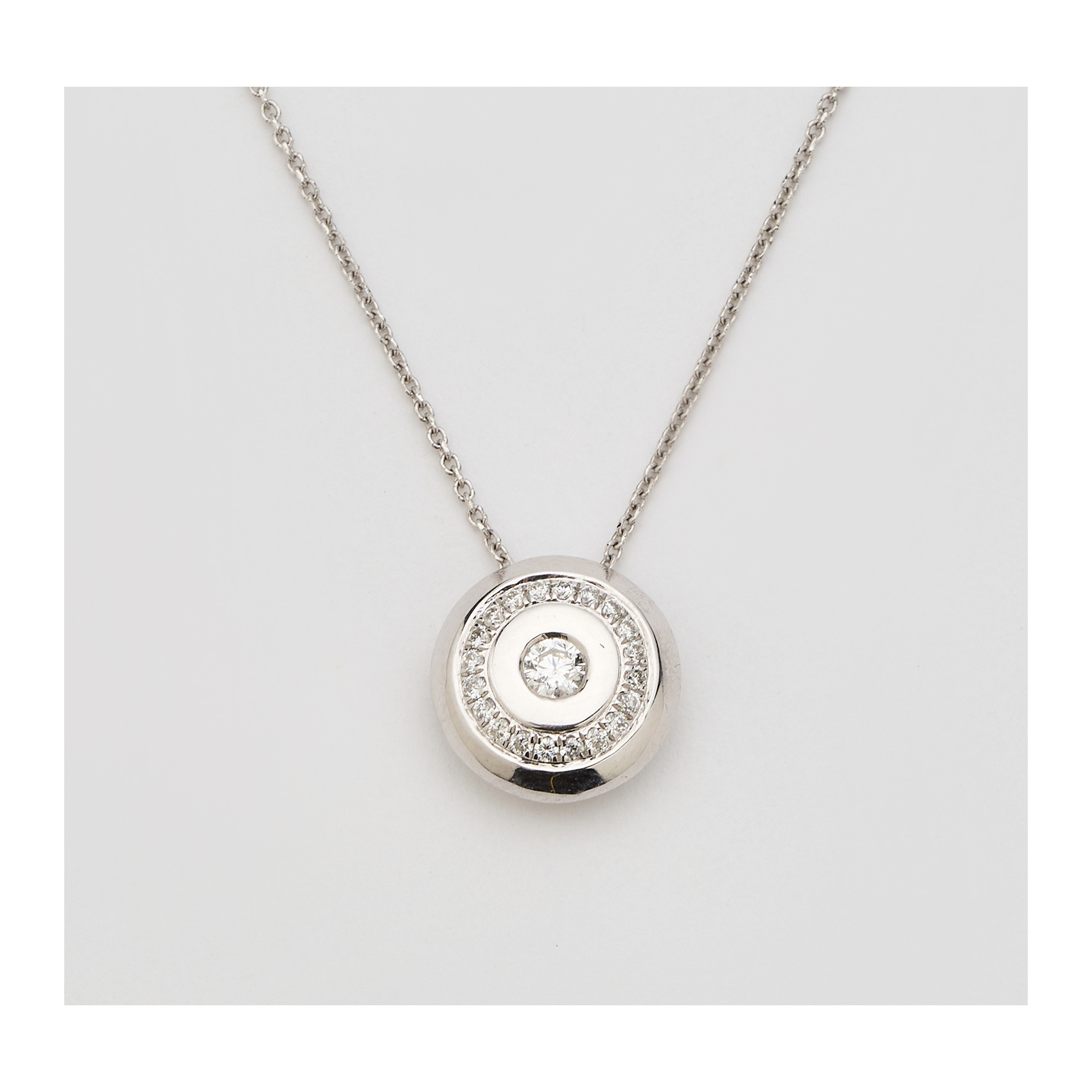 Colgante diseño circular en oro blanco con diamantes talla brillante engastados en garras y chatón.