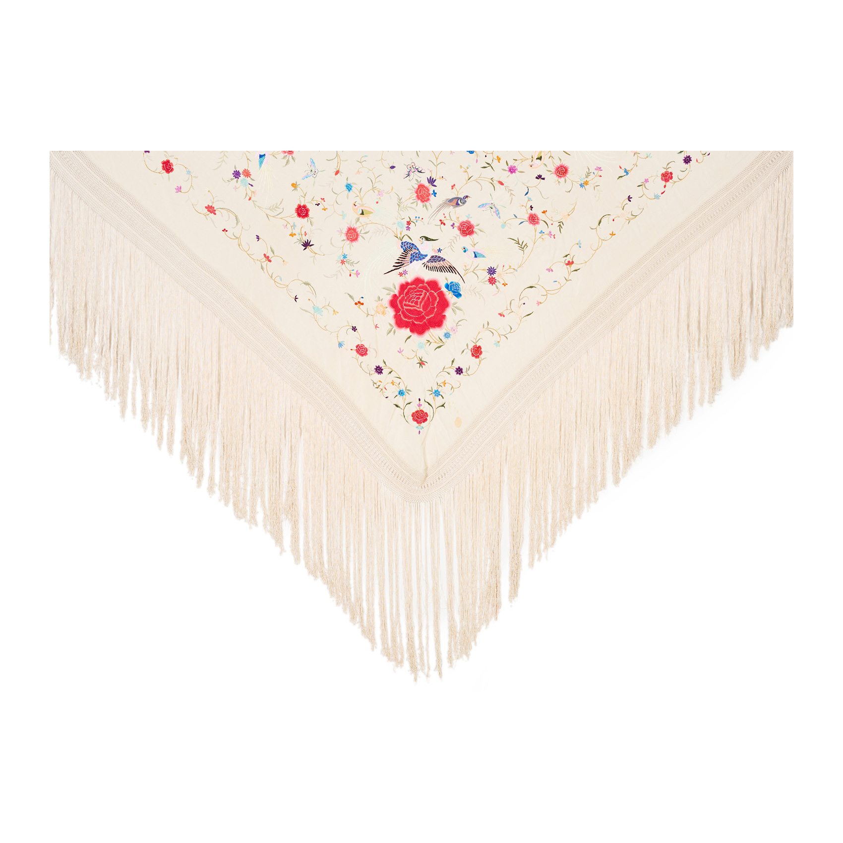 Mantón de Manila en seda tonalidad crema bordada a mano con decoraciones florales y de aves en varias tonalidades, s.XX.