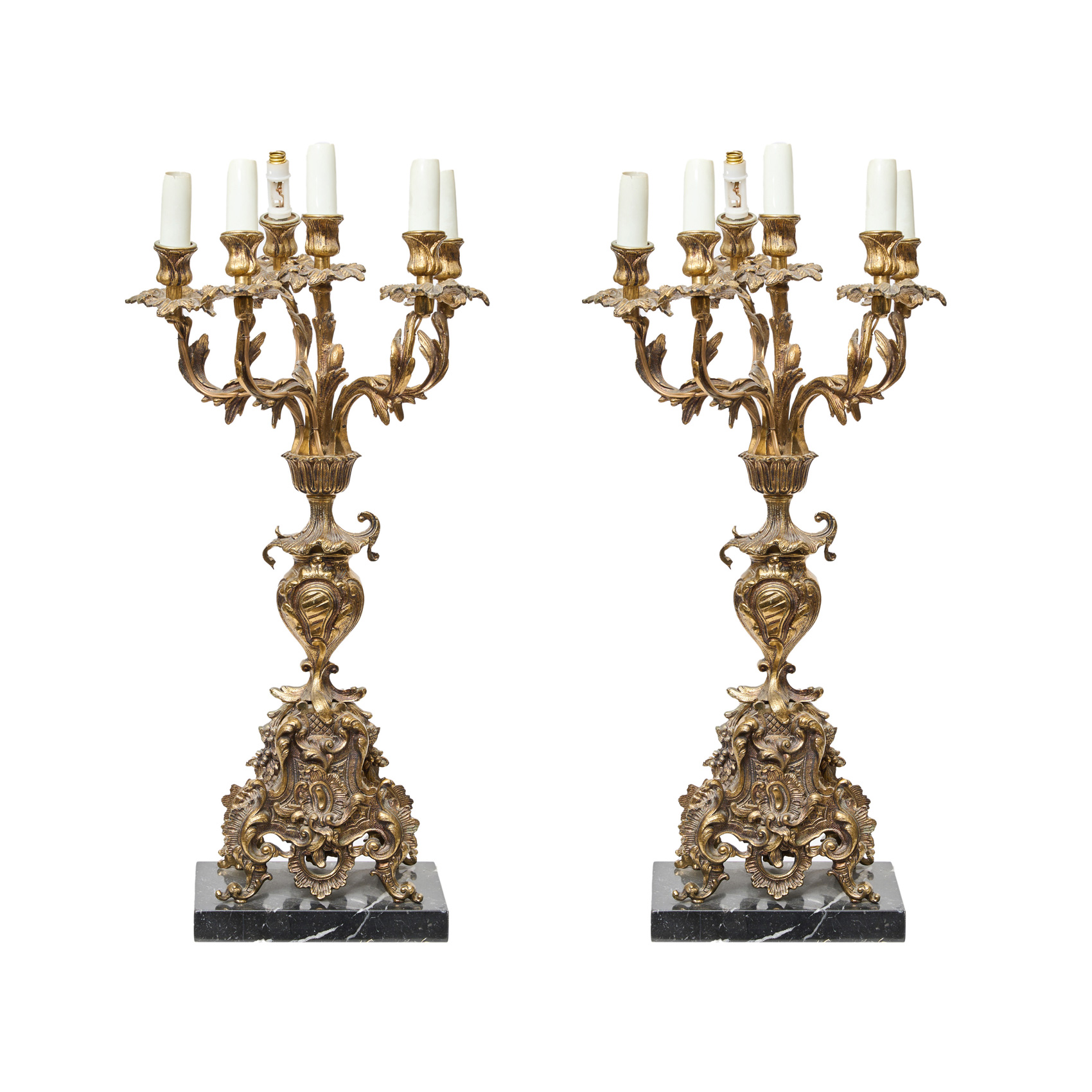 Pareja de candelabros de cinco luces estilo rococó en bronce dorado sobre peana en mármol negro veteado, s.XX. Electrificados.
