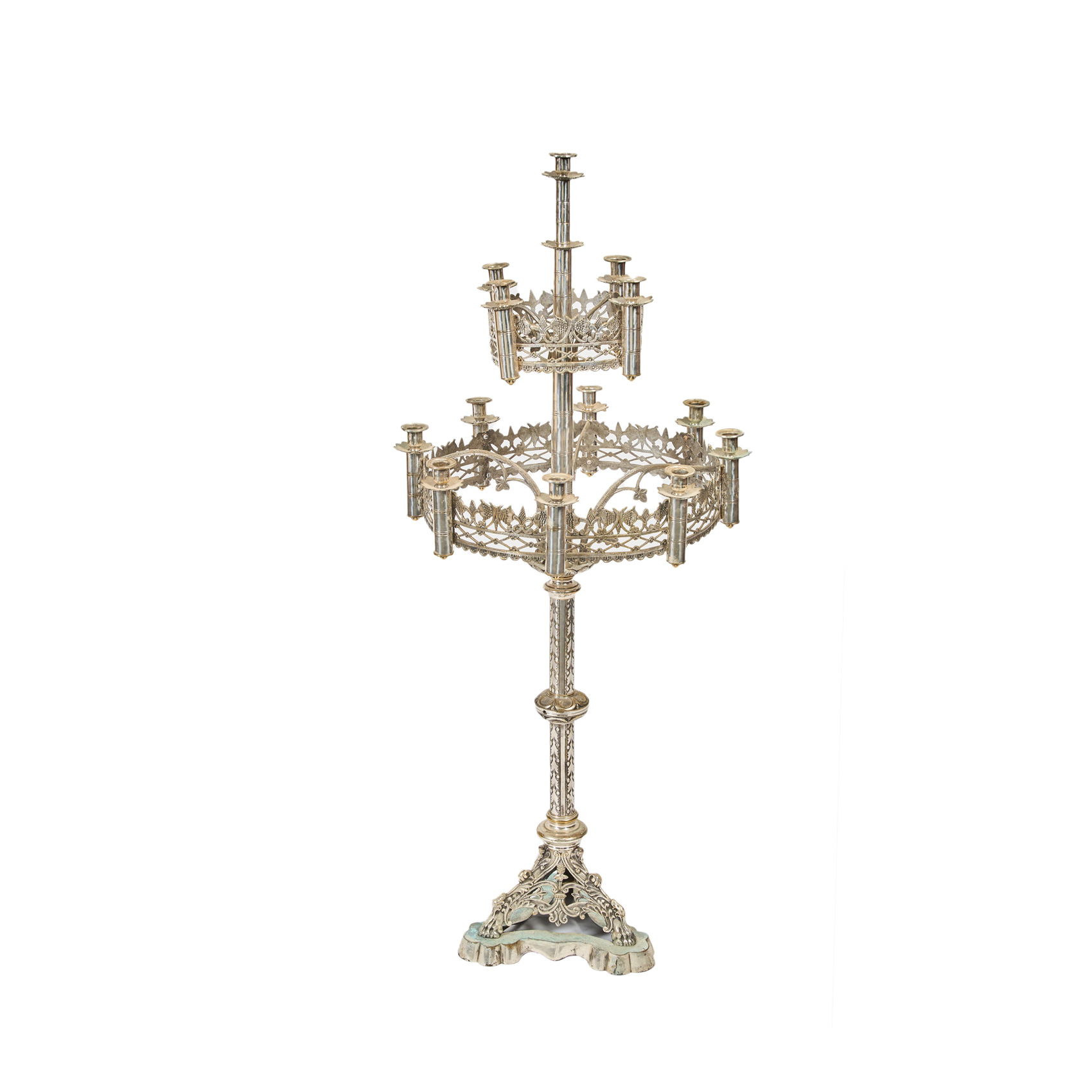 Candelabro neogótico de trece luces en metal plateado con decoración de cresterías y motivos vegetales, s.XX.