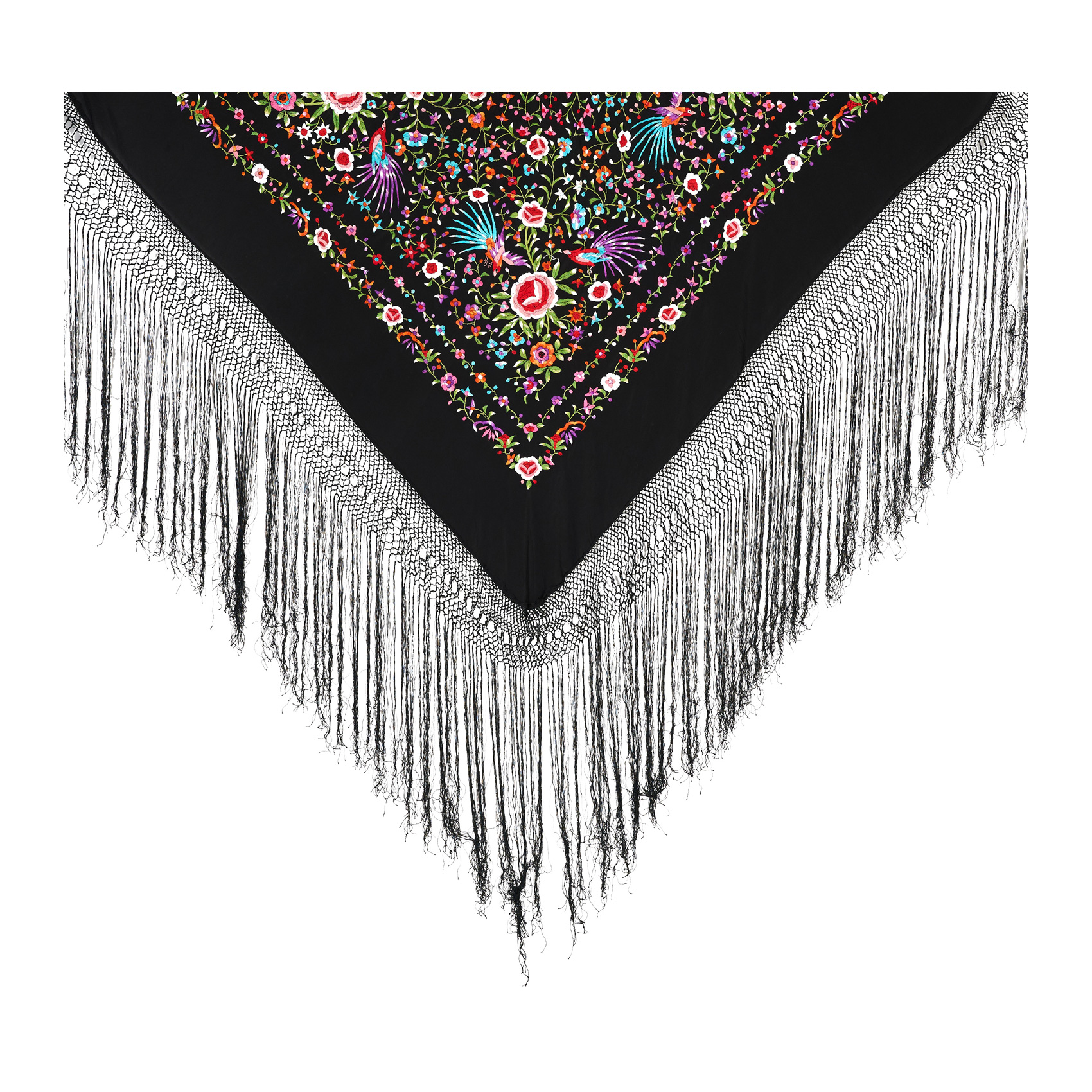 Mantón de Manila en seda negra bordada a mano con decoraciones de motivos florales y de aves en varias tonalidades, s.XX.