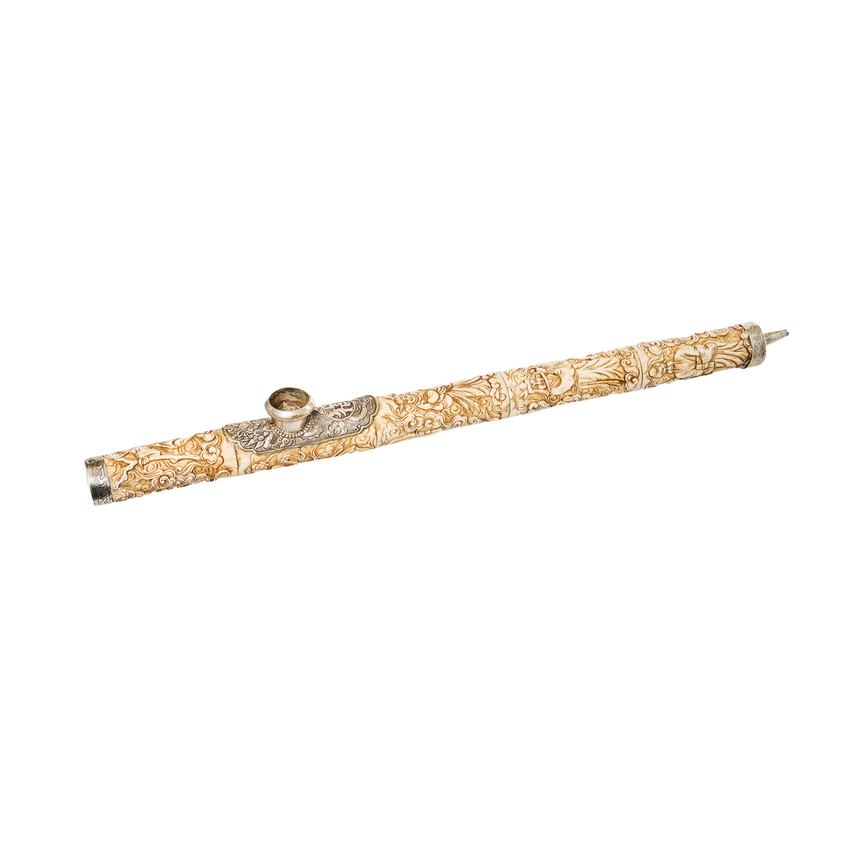 Pipa de opio en hueso tallado con aplicaciones en plata y decorada con deidades y sabios en relieve, ppios. del s.XX.