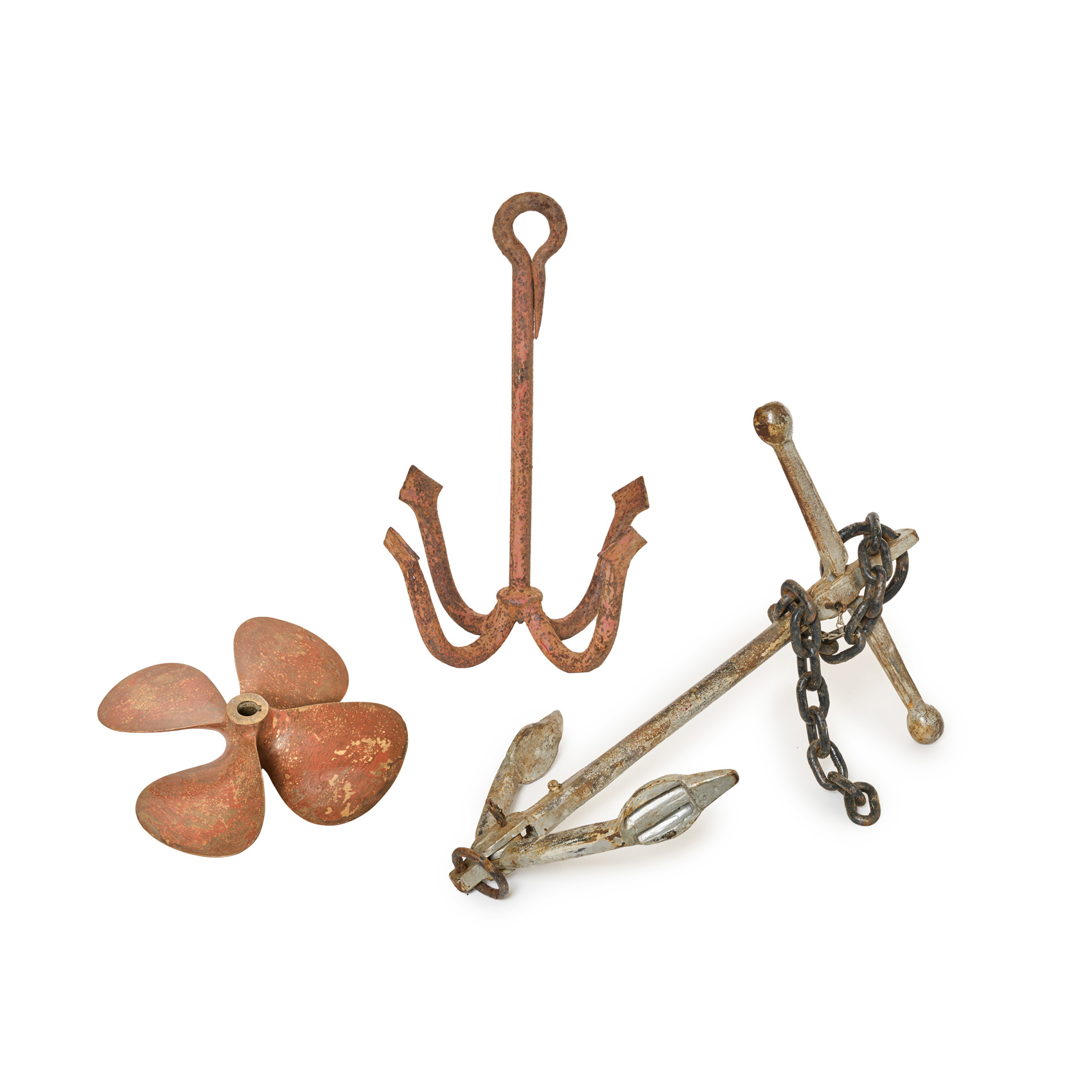 Lote formado por dos anclas naúticas y hélice en hierro forjado, ppios. del s.XX.