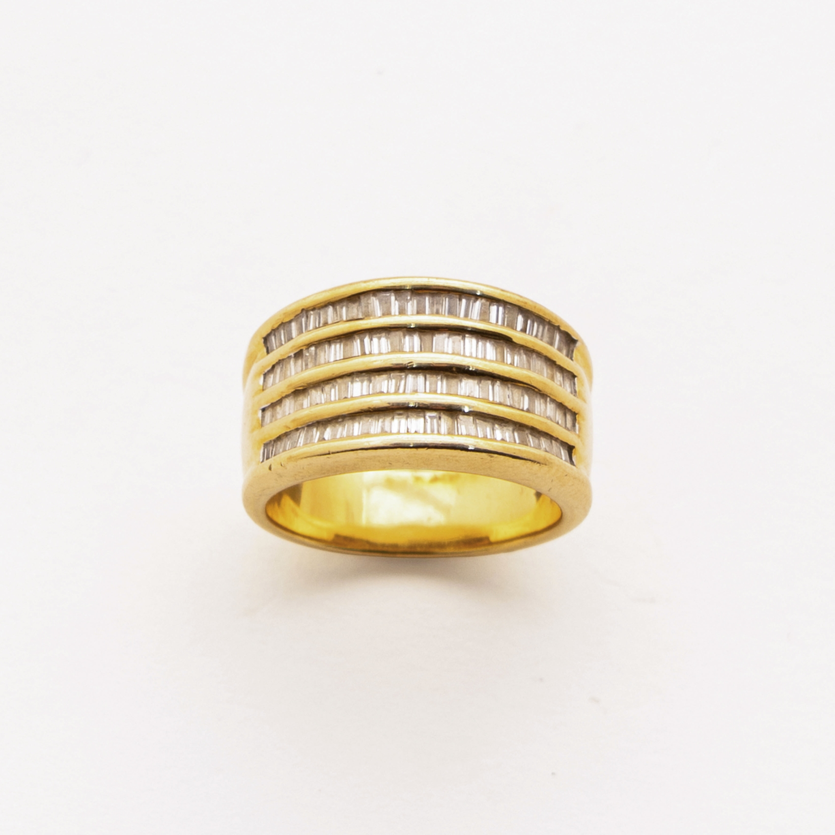 Sortija en oro con bandas de diamantes talla trapecio engastados en carril.