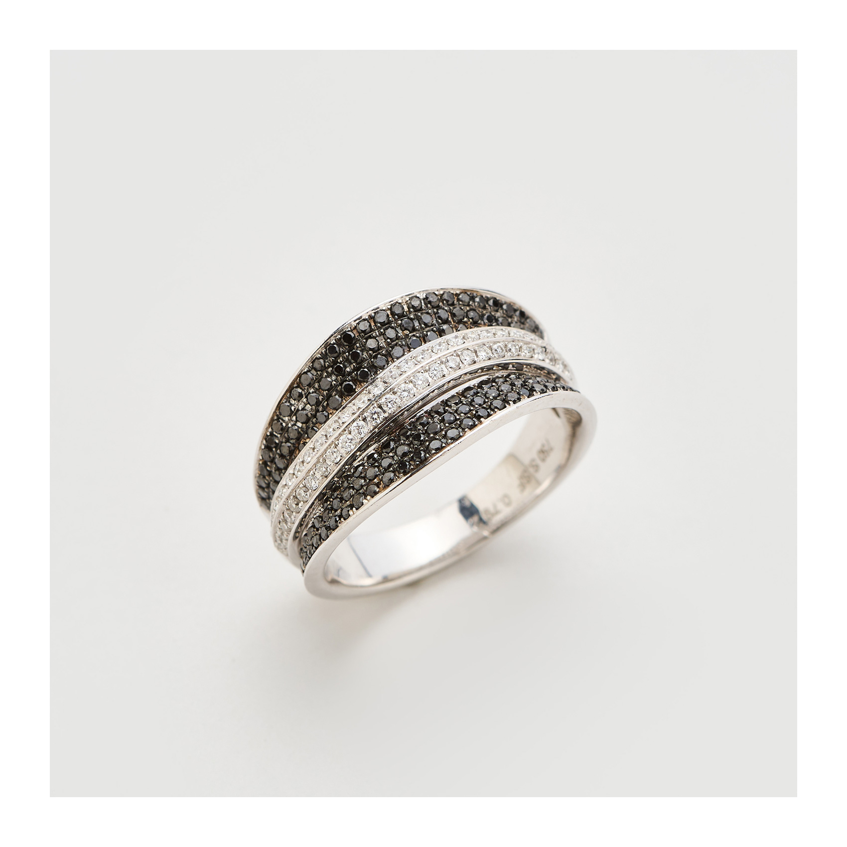 Sortija en oro blanco con diamantes talla brillante blancos y negros.