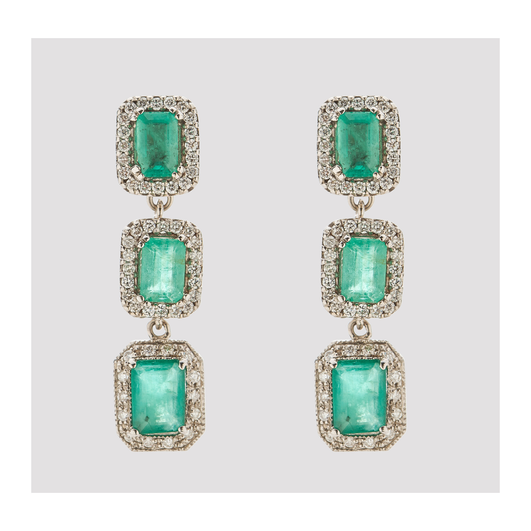 Pendientes largos en oro blanco con tres rosetones de esmeralda talla octogonal orladas por diamantes talla brillante.