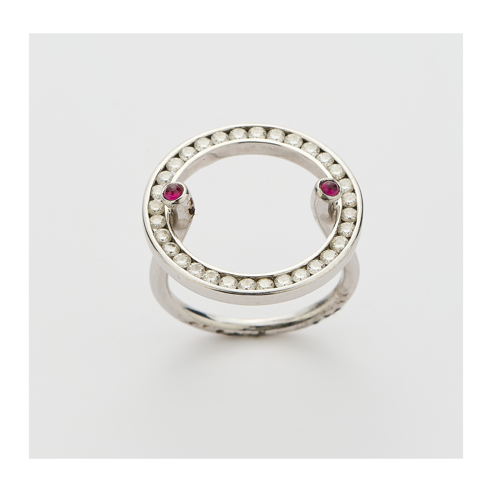 Sortija diseño círculo calado en oro blanco con diamantes talla brillante engastados en carril y dos cabujones de rubí engastados en chatón.