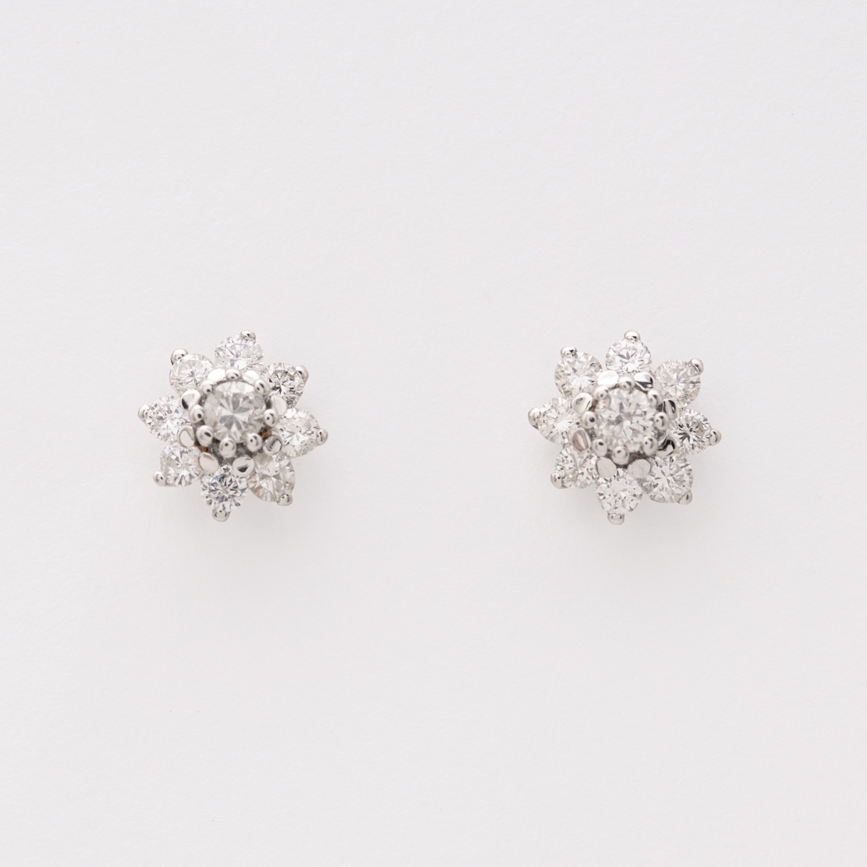 Pendientes rosetón en oro blanco con diamantes talla brillante engastados en garras.