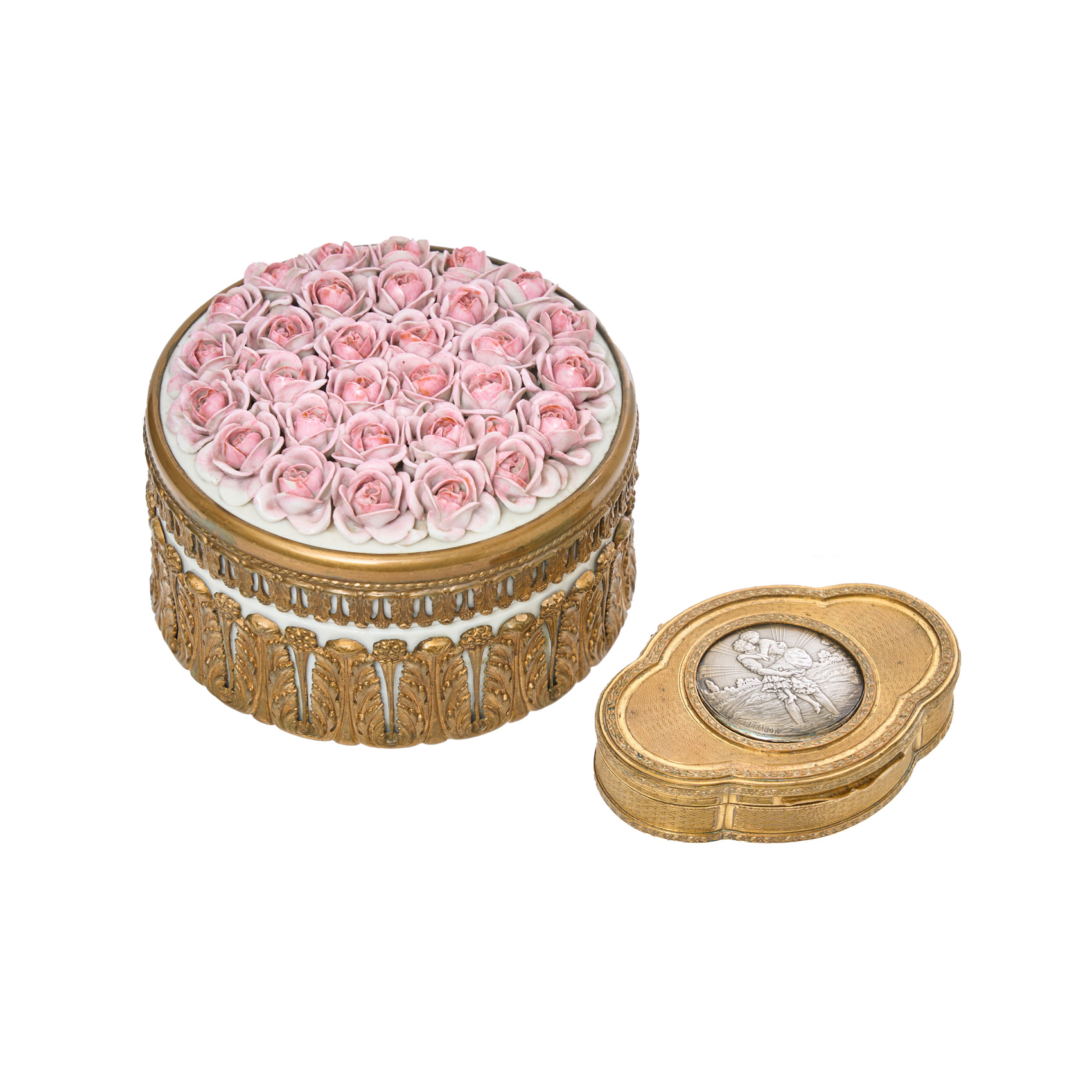Lote formado por dos cajas, c.1900-1920. Una en porcelana esmaltada y aplicaciones vegetales en latón dorado con tapa decorada por rosas en relive. Otra en bronce dorado con placa circular en plata con pareja galante. Firmada P. Brandt una.
