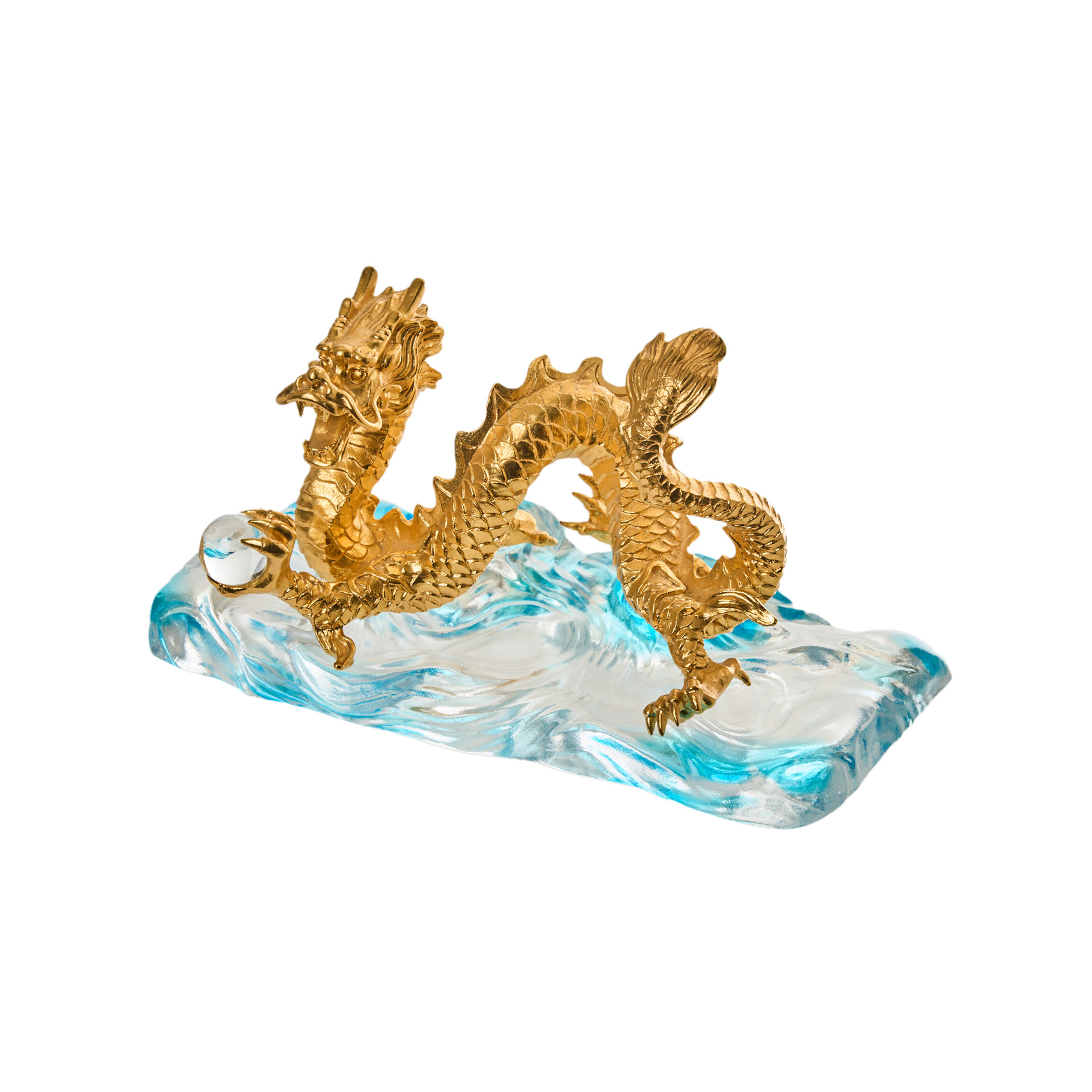 Dragón chino en bronce dorado con esfera en cristal en una garra y con base en cristal de tonalidad translúcida y azulada, s.XX.