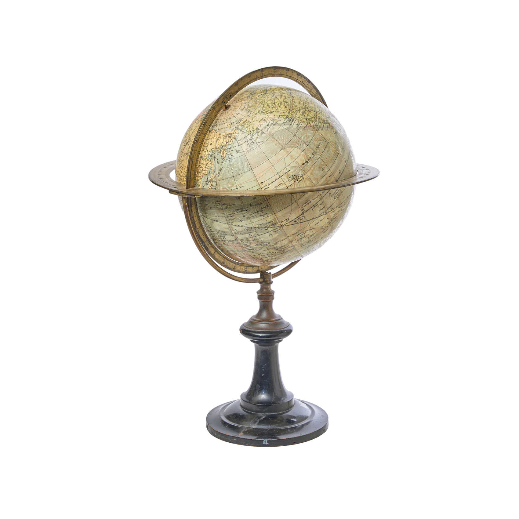 Globo terráqueo en papier maché y litografía sobre base en bronce dorado con pie en madera tallada, s.XIX. Realizado para la casa Faustino Paluzie, Barcelona.