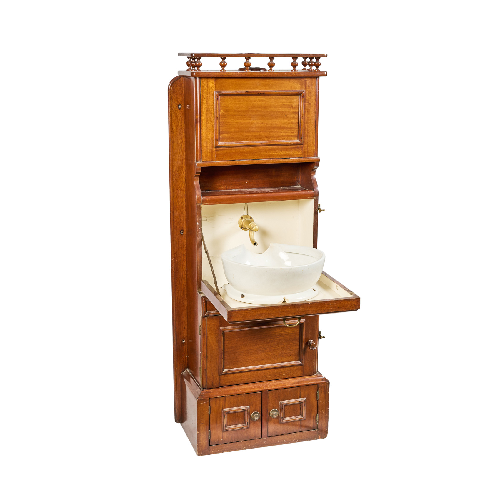 Mueble lavabo de barco en madera de caoba, ppios. del s.XX. Frente con lavabo abatible en porcelana esmaltada y parte inferior con depósito para agua.