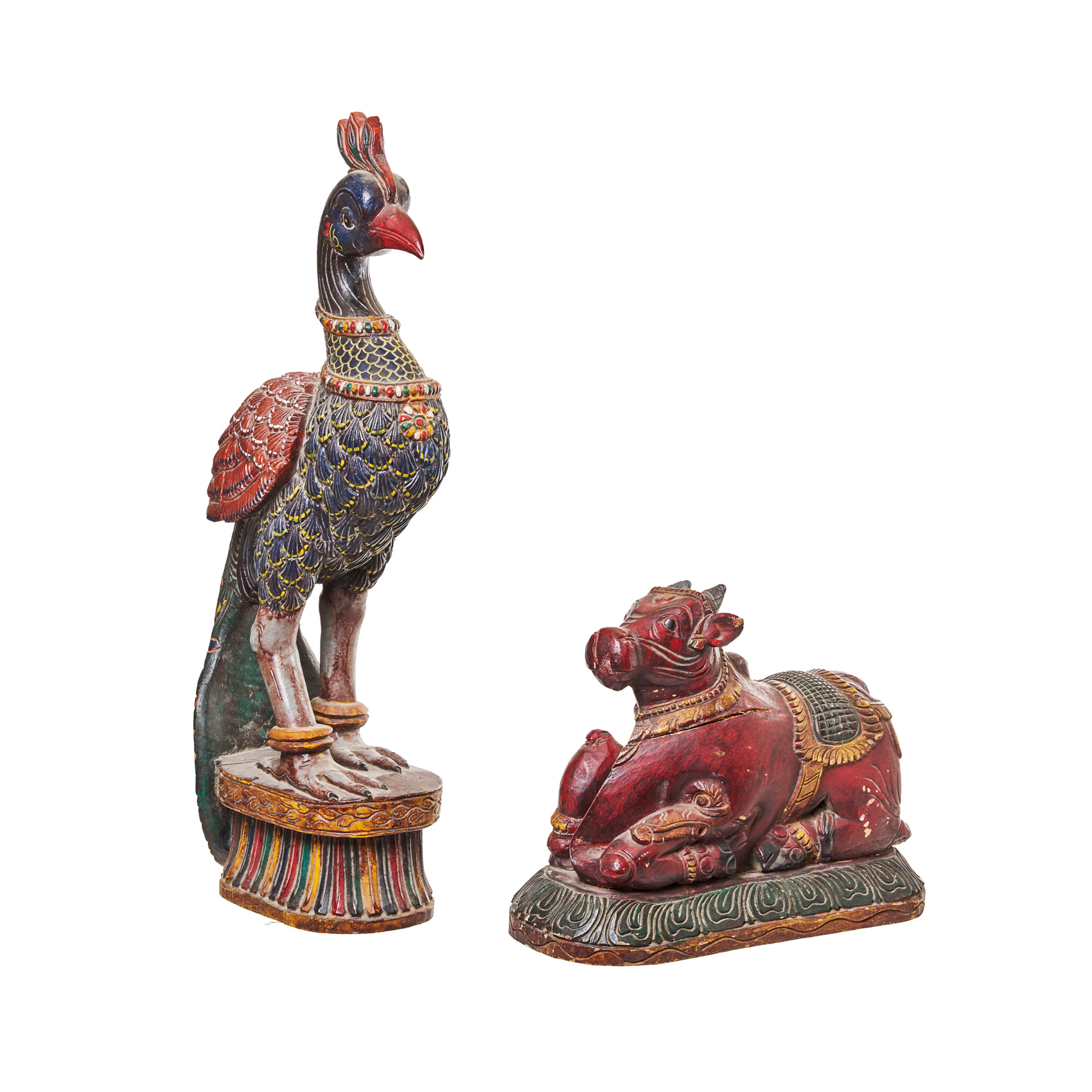 Búfalo y Pavo real. Pareja de esculturas indias en madera tallada y policromada, s.XX.
