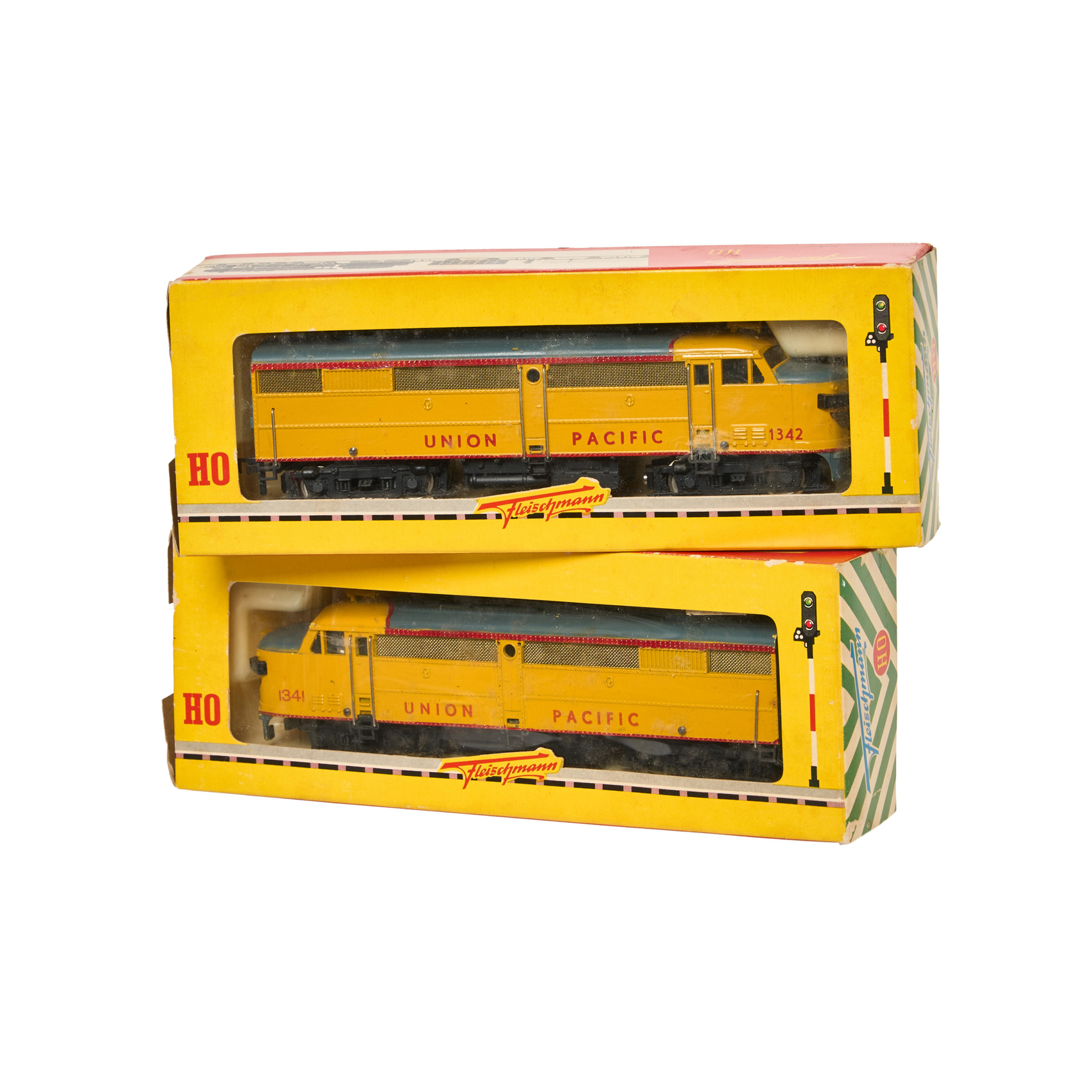 Pareja de maquetas de locomotoras diesel dobles modelo Union Pacific 1341 y 1342 de la manufactura alemana Fleischmann, c.1960-1970. Se presentan en su caja original.