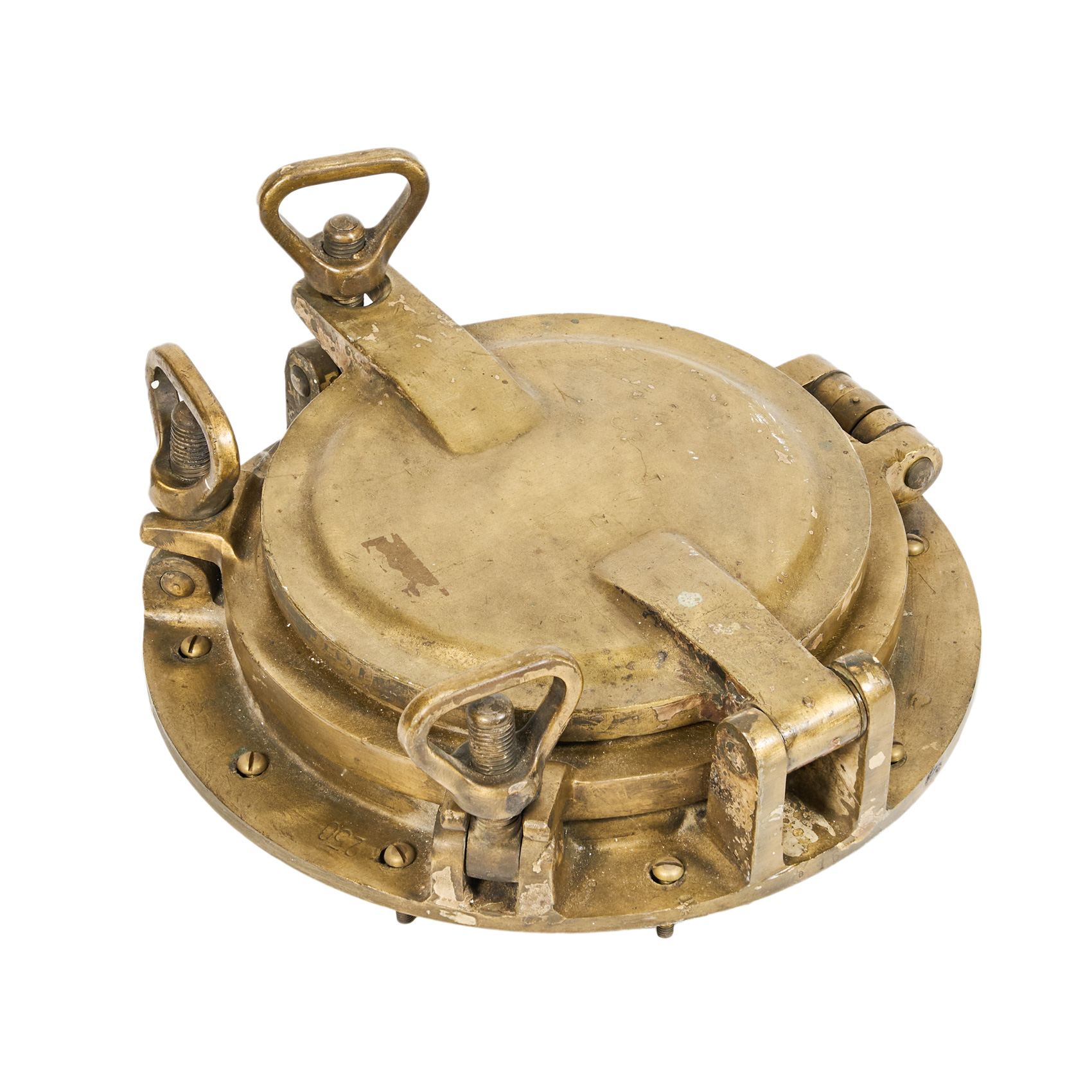 Ventana de barco «ojo de buey» italiana en bronce dorado, c.1947. Numerada 3024/1947. Presenta marcas inscritas.