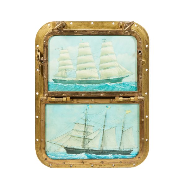 Ventana de camarote en bronce dorado con impresiones marítimas anexionadas al cristal, ppios. del s.XX. Marcadas SAMEN.