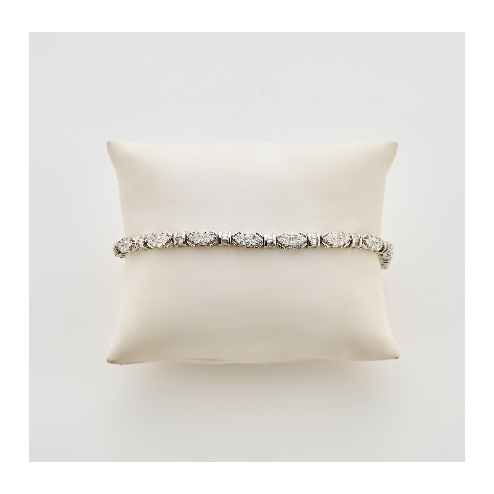Pulsera en oro blanco con motivos ojivales de diamantes talla brillante y semicírculo de diamantes talla baguette alternados.