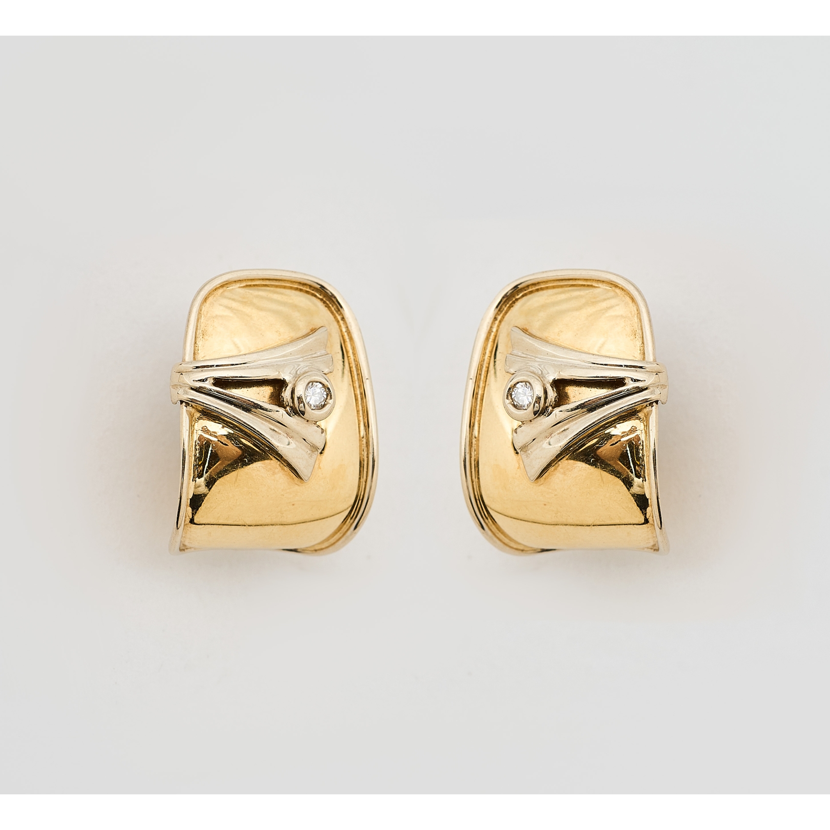Pendientes diseño media criolla en oro bicolor con circonita engastada en chatón.