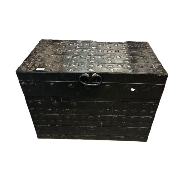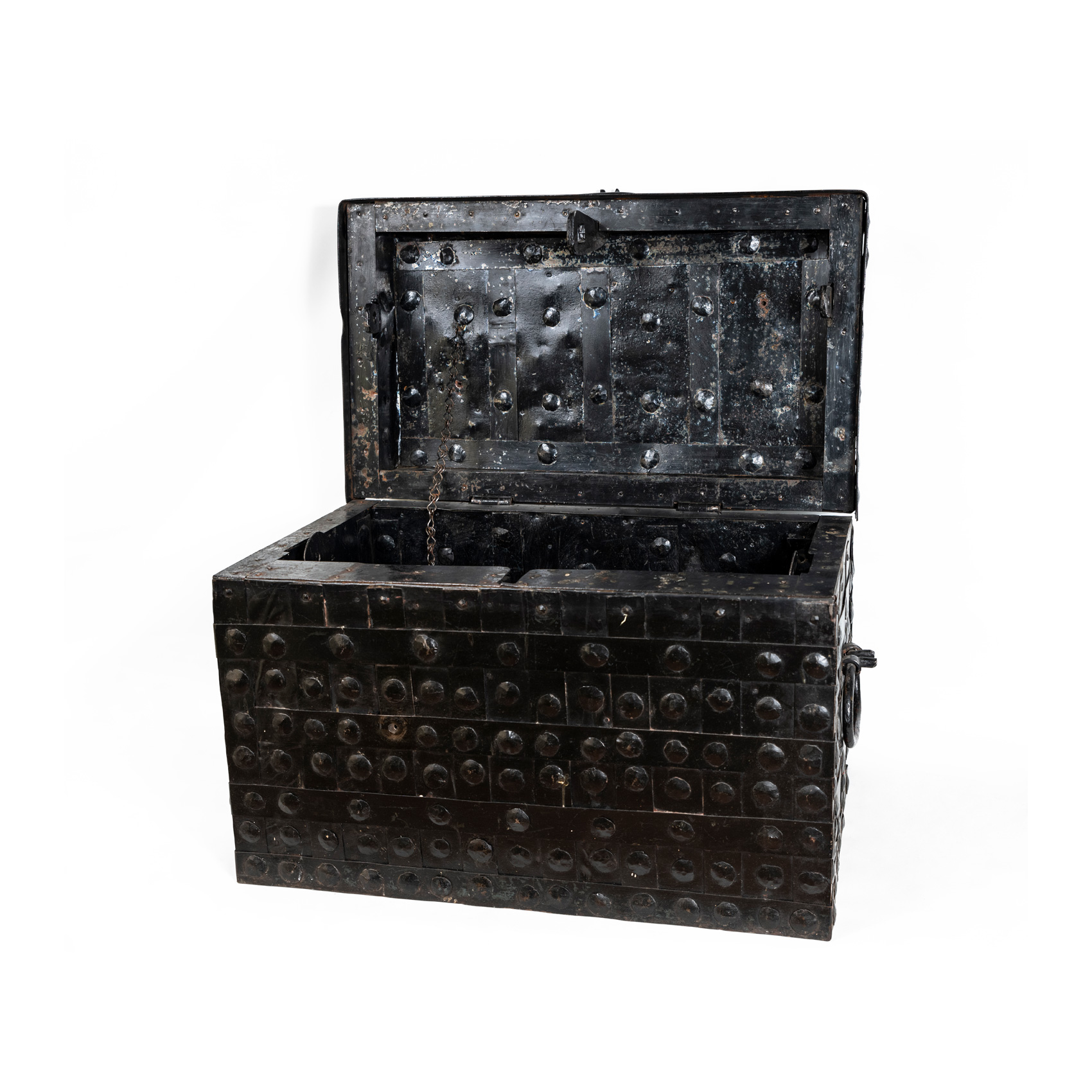 Caja de caudales en hierro forjado y tachuelado con asas en laterales, s.XVIII.