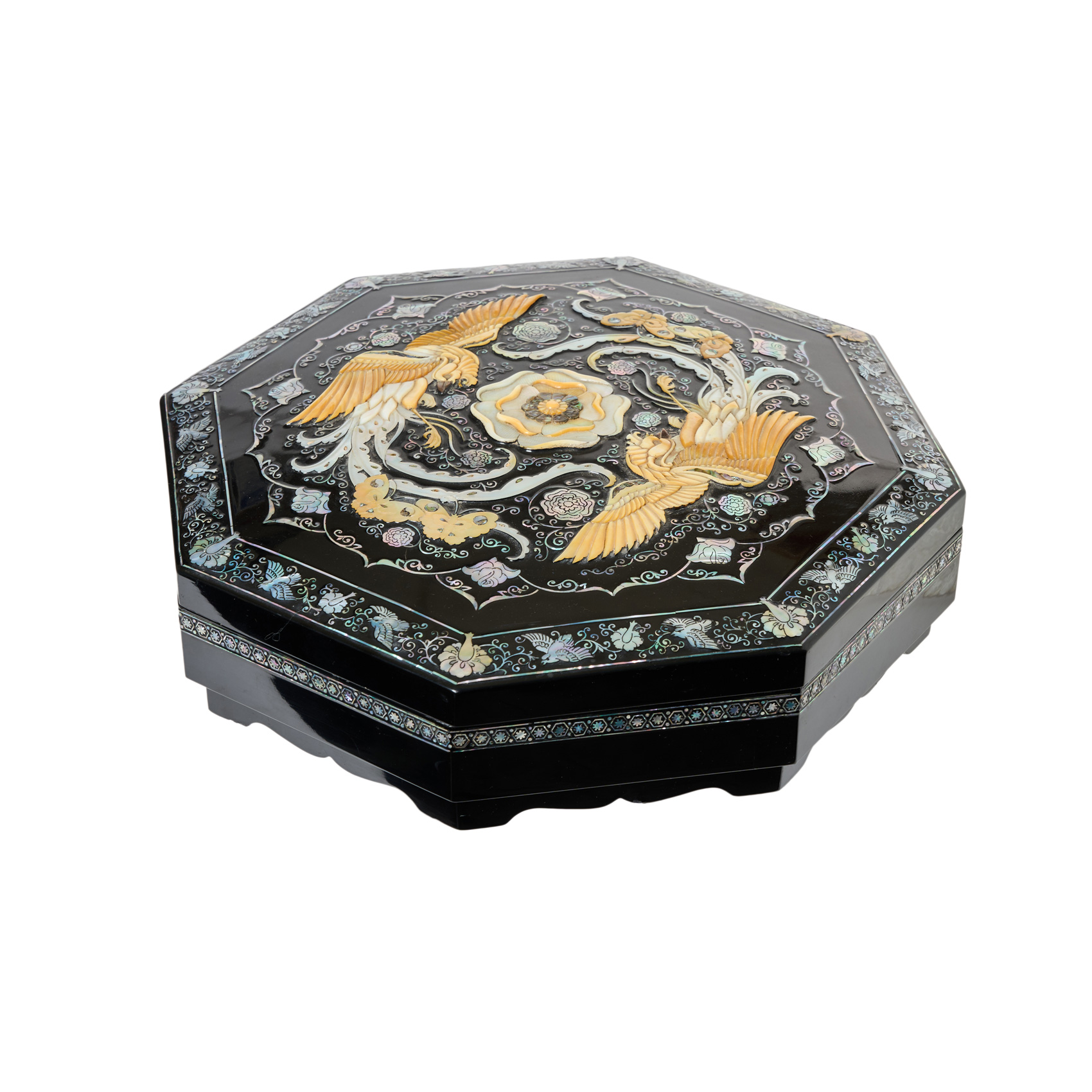 Caja coreana octogonal en madera tallada y lacada con incrustaciones en nácar de motivos florales, mariposas y de aves fénix, segunda mitad del s.XX.