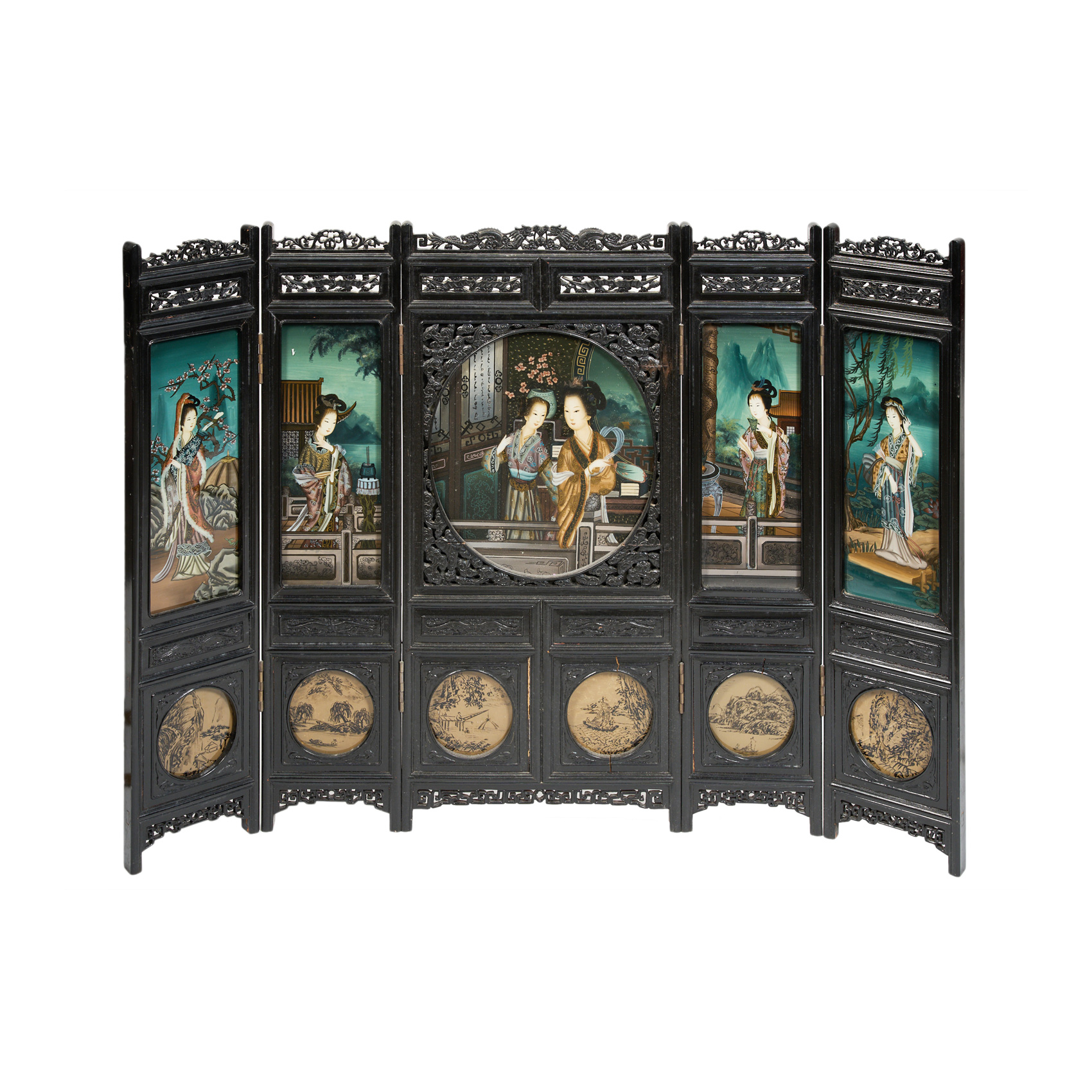 Biombo japonés de sobremesa de cinco hojas en madera frutal tallada y lacada con representaciones acristaladas de damas de corte y parte inferior con tondos de escenas paisajísticas, s.XX.