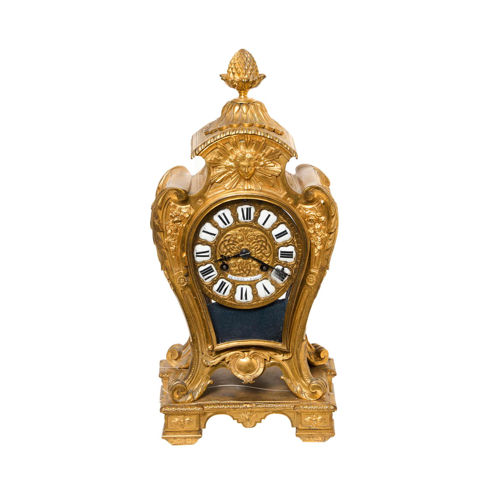 Reloj francés de sobremesa estilo Luis XVI en bronce dorado con decoración floral y vegetal, remate en forma de piña y mascarón en la parte central superior, fles. del s.XIX. Esfera con numeración romana en cartelas de porcelana esmaltada. Maquinaria París Japy Freres con sonería de horsa y medias. Marcado en esfera «Deniere à Paris». Adjunta péndulo y llave.