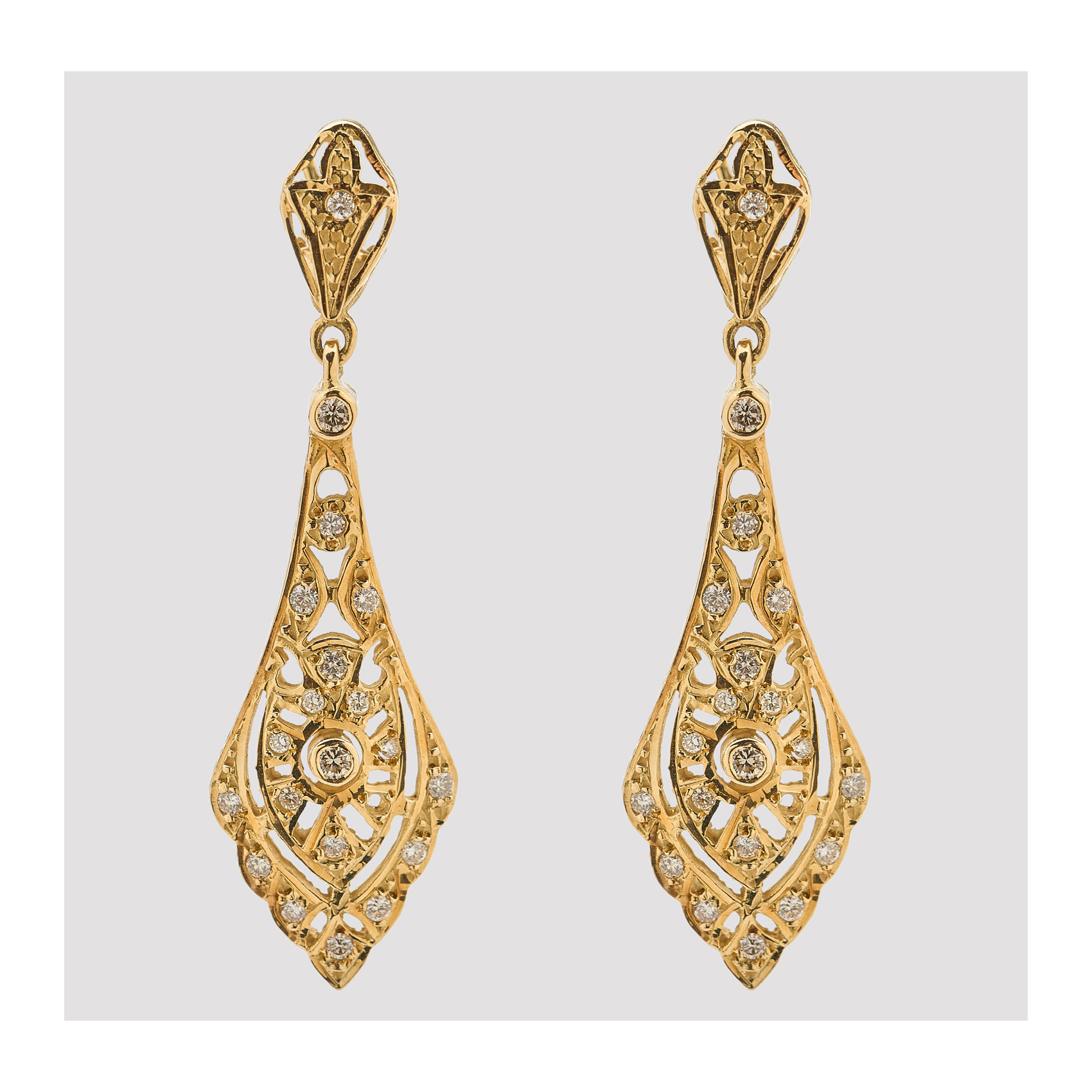 Pendientes largos calados estilo Art Deco en oro con diamantes talla brillante.