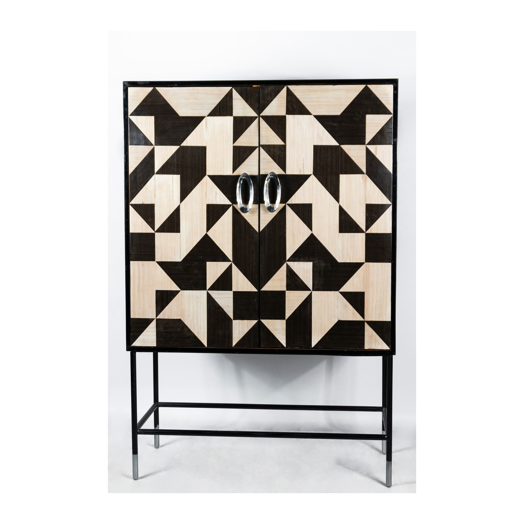 Mueble auxiliar o licorero con dos puertas batientes decoradas por marqueterías bicolor de motivos geométricos, s.XX.