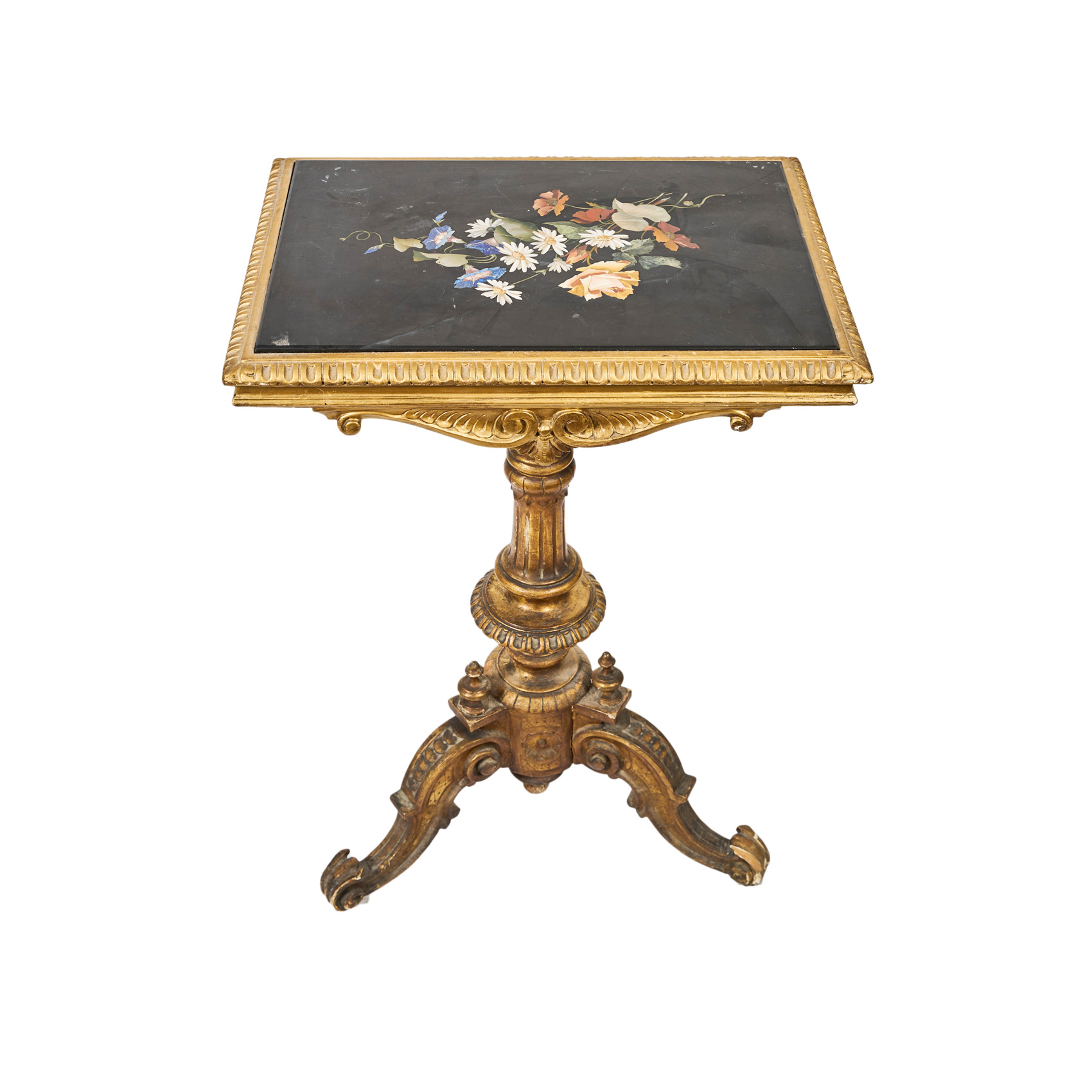 Mesa auxiliar en madera tallada y dorada con sobre en piedras duras sobre fondo en mármol negro y decoración floral a partir de piedras embutidas semipreciosas, ppios. del s.XX. Siguiendo modelos italianos del s.XVII.