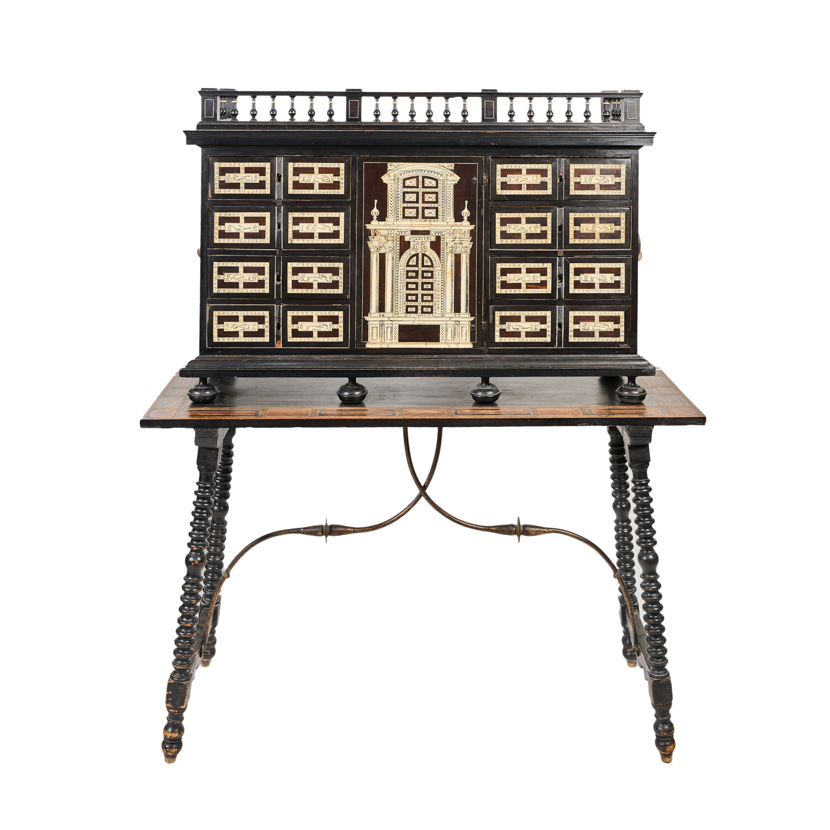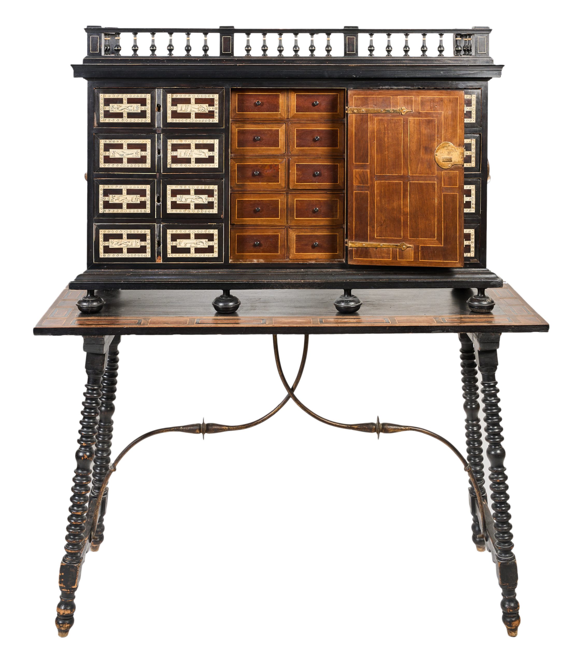 Bargueño de muestra descubierta en madera ebonizada e incrustaciones en hueso, ppios. del s.XIX. Frente de tres calles compartimentadas por cuatro gavetas, las laterales y la central con puerta batiente. Decorado por placas en hueso pirograbadas. Laterales con escenas cinegéticas y puerta central de inspiración arquitectónica con gavetas al interior decoradas por fileteado en limoncillo. Parte superior abalaustrada. Apoya sobre bufete con sobre de marqueterías en maderas frutales con patas de lenteja y fiadores en hierro.