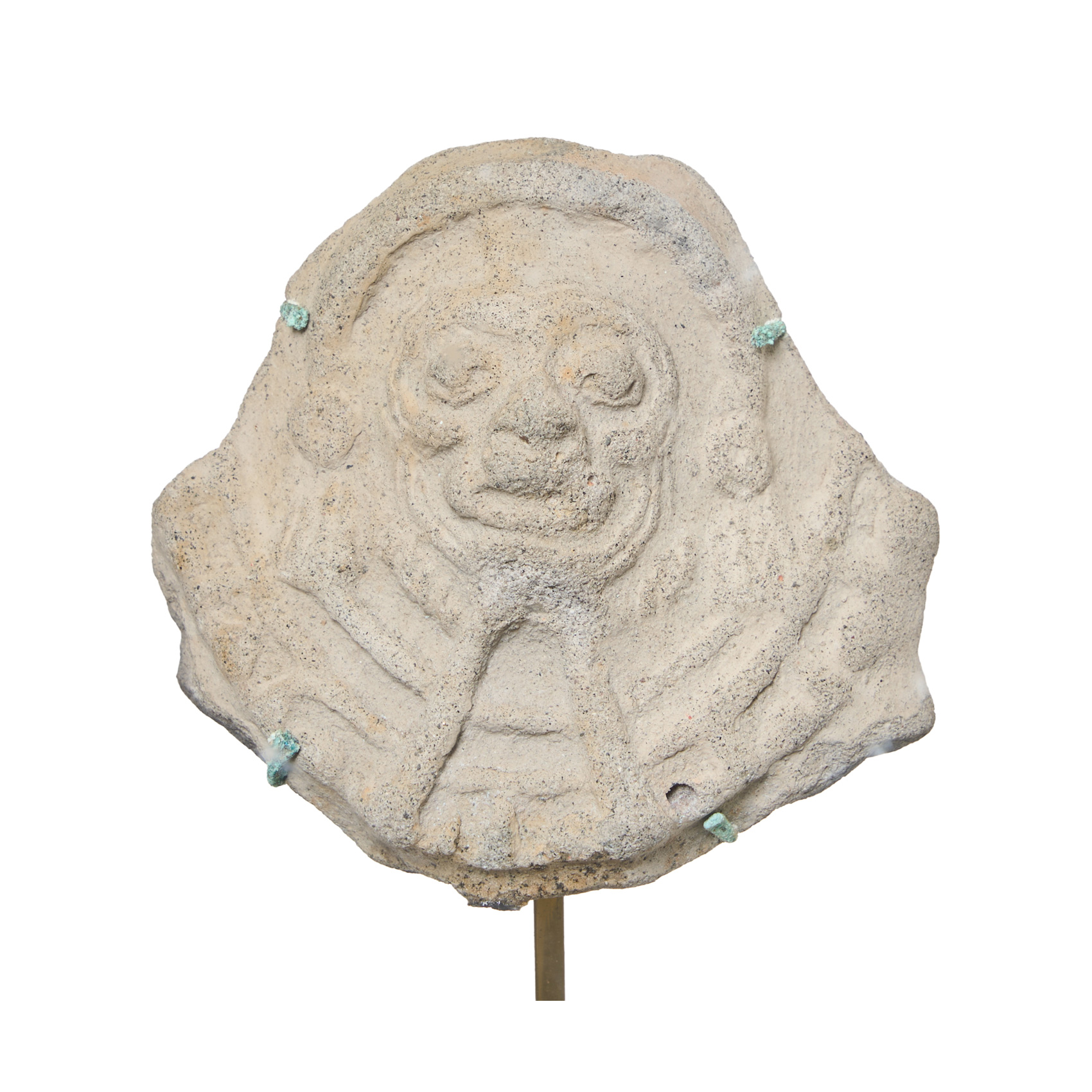 Fragmento de escultura precolombina en terracota con representación de personaje. Cultura Tumaco – La Tolita, actual Ecuador y Colombia, 500 a.C.-500 d.C. Custodiado en urna expositora. En buen estado de conservación. Adjunta certificado de autenticidad.