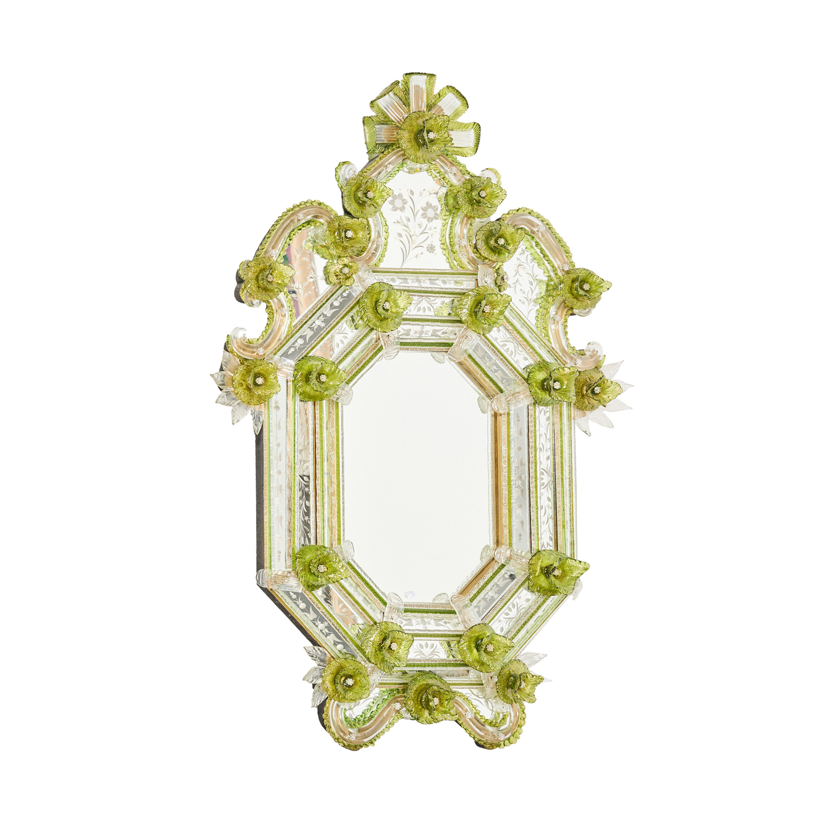 Espejo veneciano en cristal de Murano de tonalidad translúcida y verde con aplicaciones rizadas y de motivos florales, ppios del s.XX.