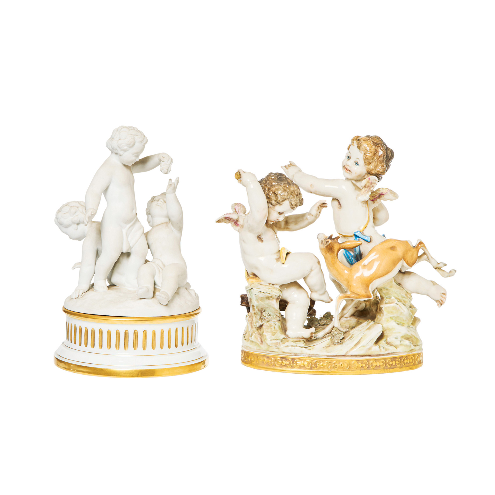 Infantes con uvas y angelotes con cervatillo. Pareja de esculturas en porcelana esmaltada y biscuit sobre peana en porcelana parcialmente dorada, s.XX. Marcas en la base.