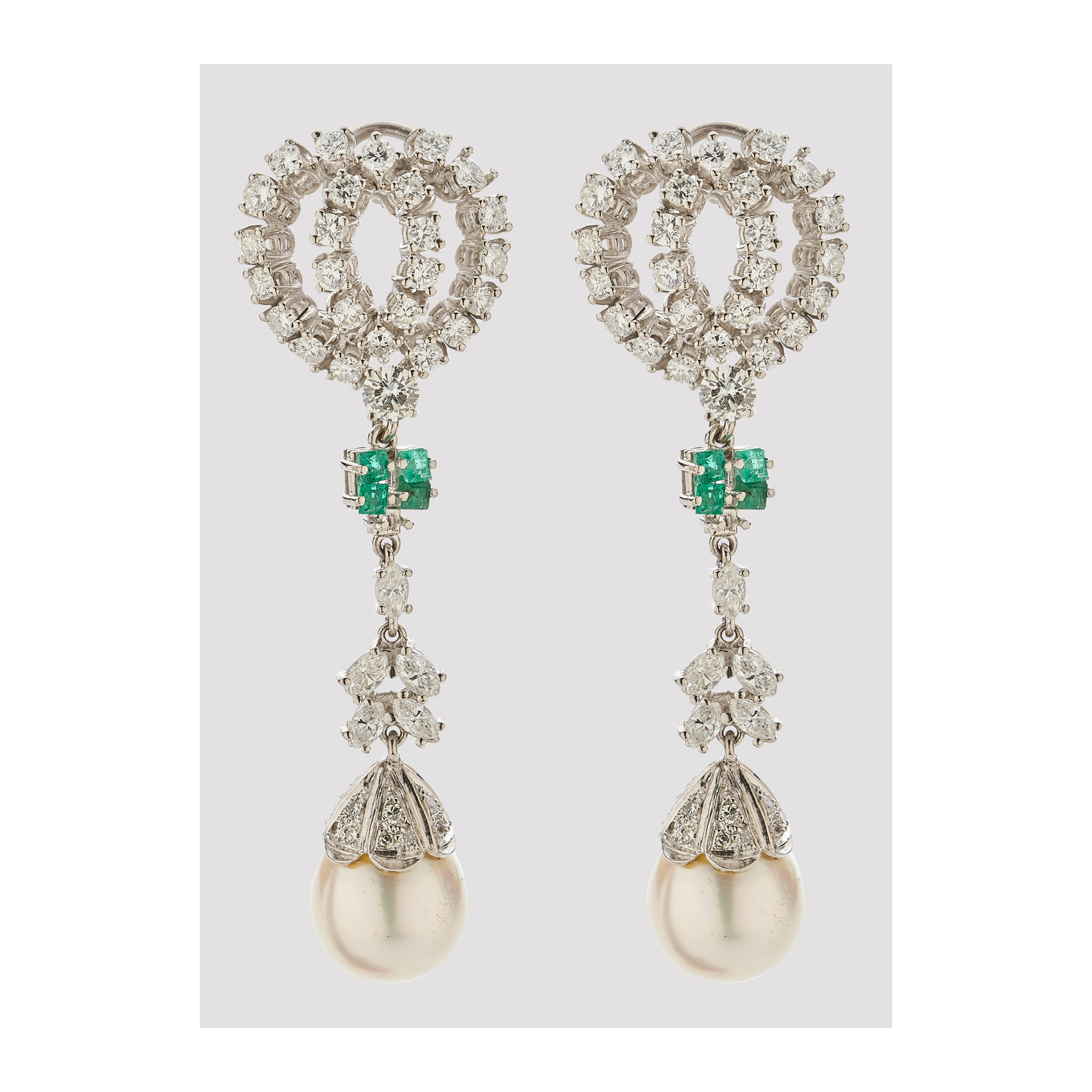 Pendientes largos desmontables en oro blanco con diamantes tallas brillante y marquise, esmeraldas talla carré y perla cultivada de 11 mm, 6 cm.