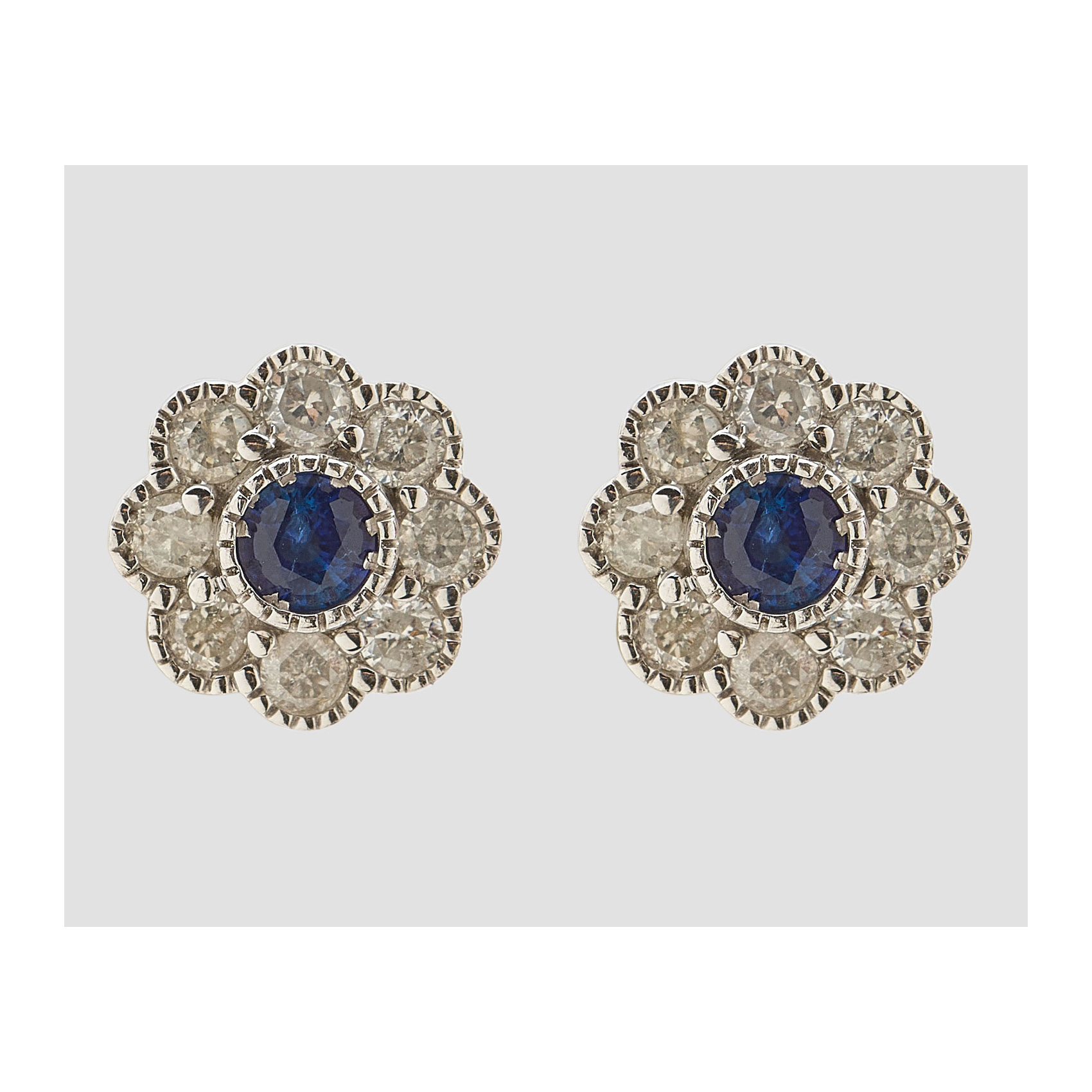 Pendientes rosetón en oro blanco con zafiro azul talla redonda orlado por diamantes talla 8/8.