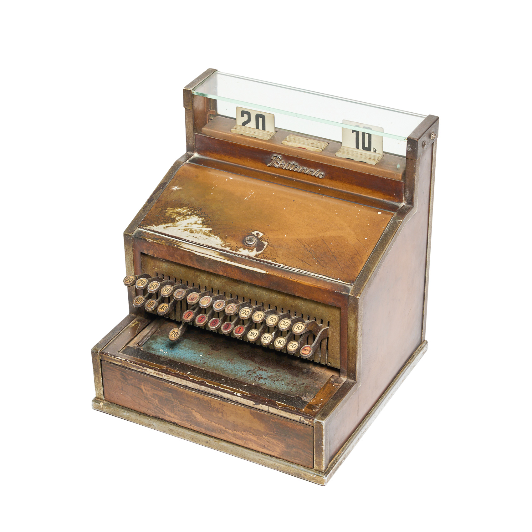 Caja registradora inglesa antigua «Britannic» en madera y metal lacado, ppios. del s.XX.