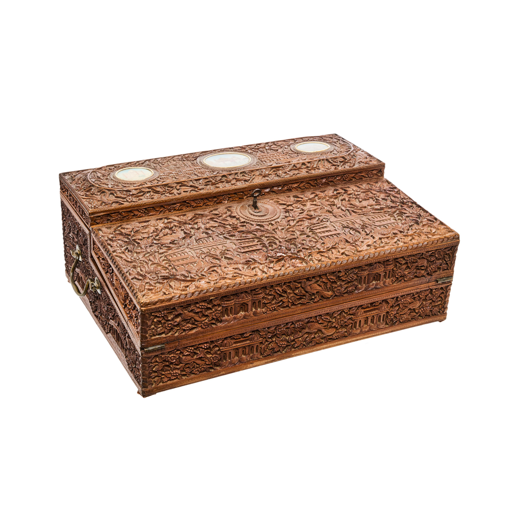 Escritorio de viaje anglo-indio en madera frutal profusamente tallada con motivos palaciegos, naturalistas y animales, s.XIX. Rematada por tres miniaturas pintadas al guache sobre placas en hueso. Interior tapizado en verde con múltiples compartimentos. Adjunta llave.