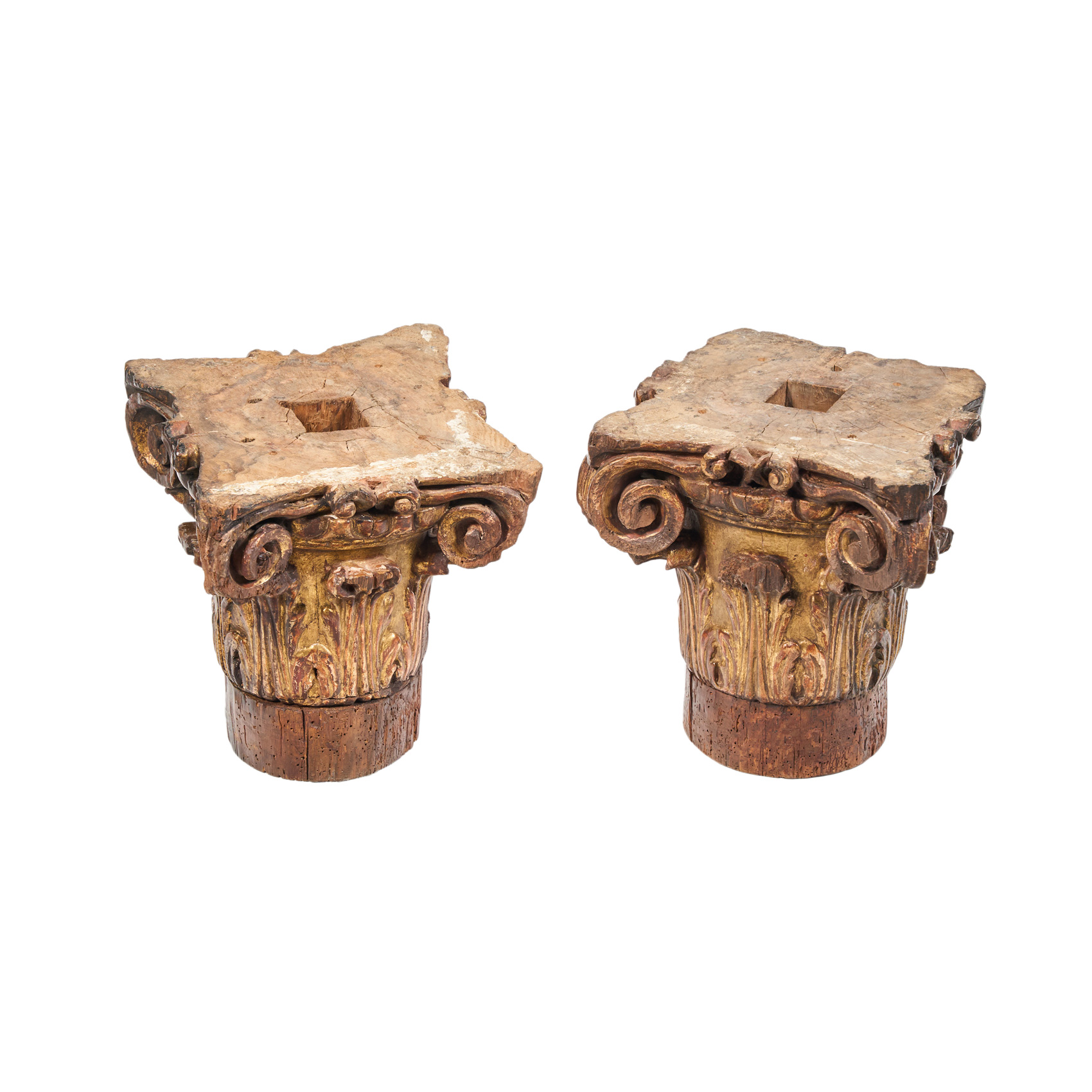 Pareja de capiteles corintios en madera profusamente tallada, estucada y sobredorada, s.XVI-XVII.