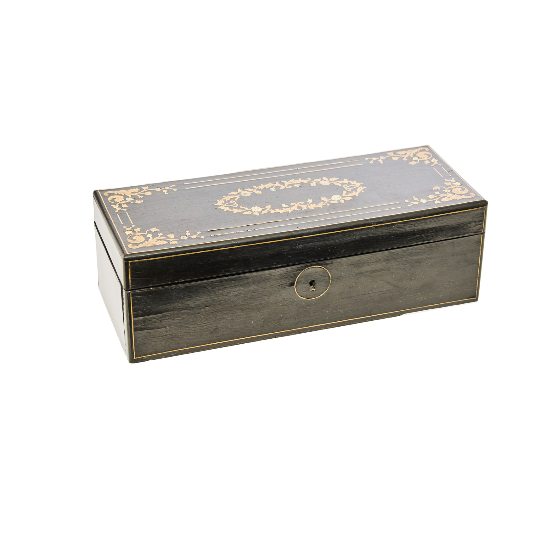 Caja Napoleon III en madera de chicaranda con marqueterías en latón dorado y pequeñas incrustaciones florales en nácar, s.XIX. Frente abatible. Sin llave.