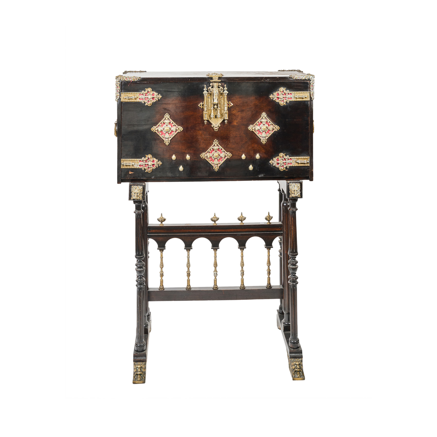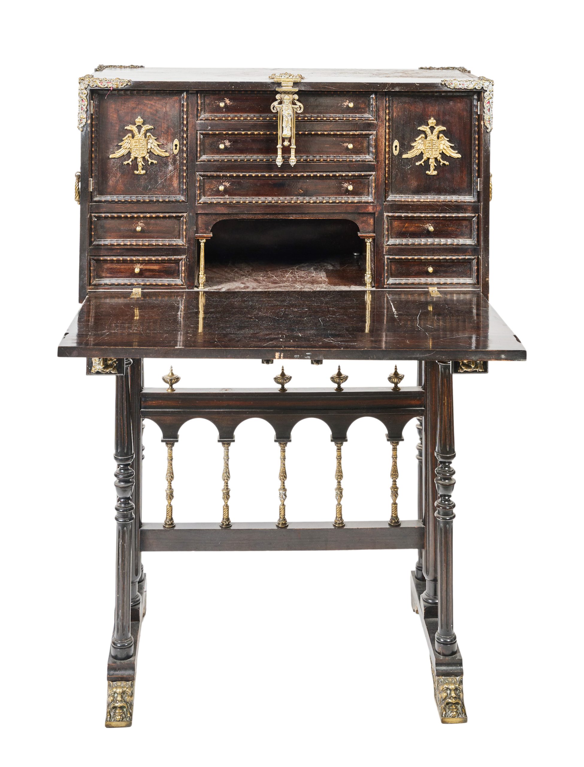 Bargueño español en madera ebonizada, s.XX. Tapa abatible y adornos en bronce dorado con fondo en terciopelo rojo y veneras. Cerradura central de pestillo con llave y figura de obispo al centro. Interior compartimentado en tres calles con gavetas y puertas batientes con aplique en bronce de águila bicéfala coronada. Reposa sobre pie de puente.