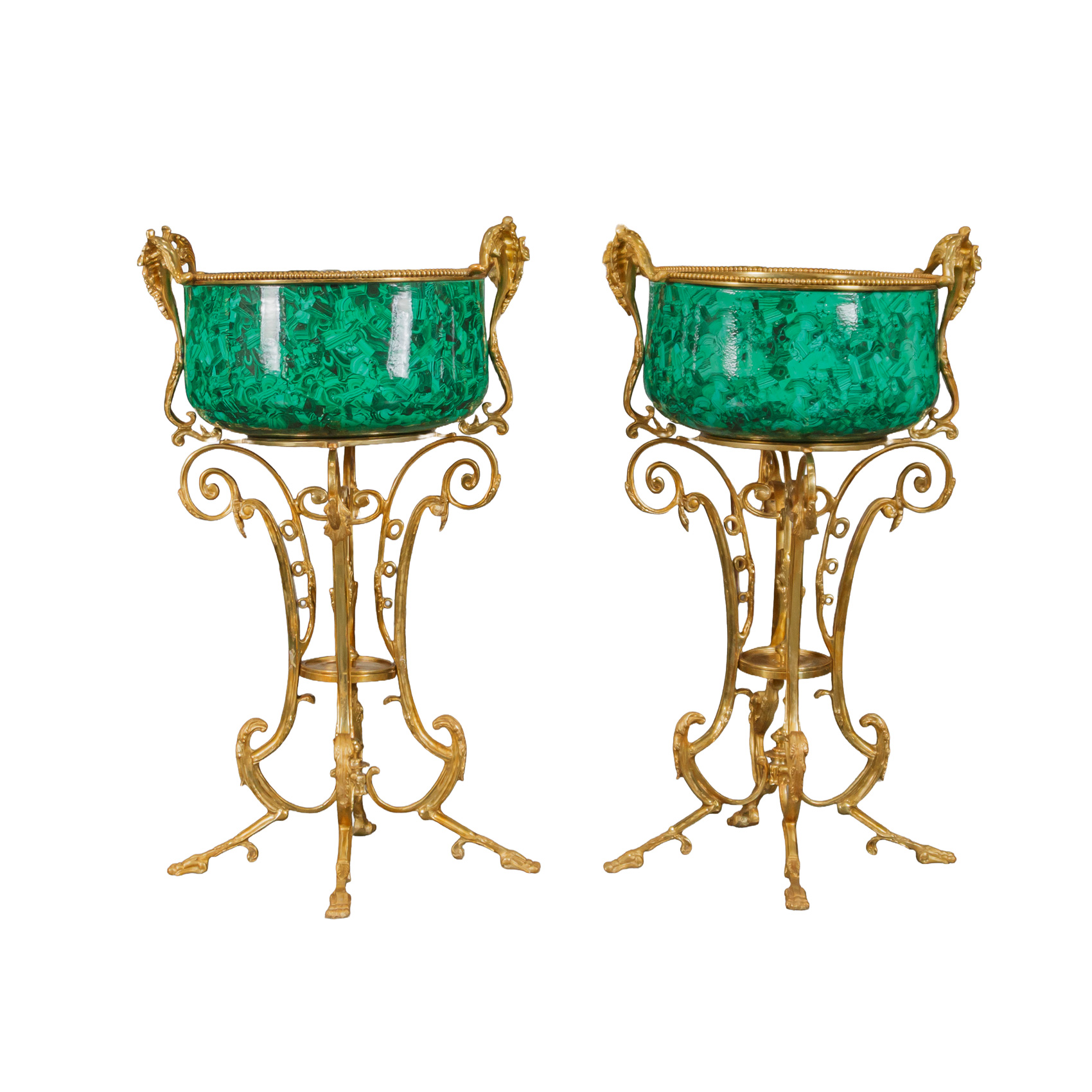 Pareja de jardineras o enfriadores en símil de malaquita sobre pie en bronce dorado con decoración de roleos y rocallas, s.XX.