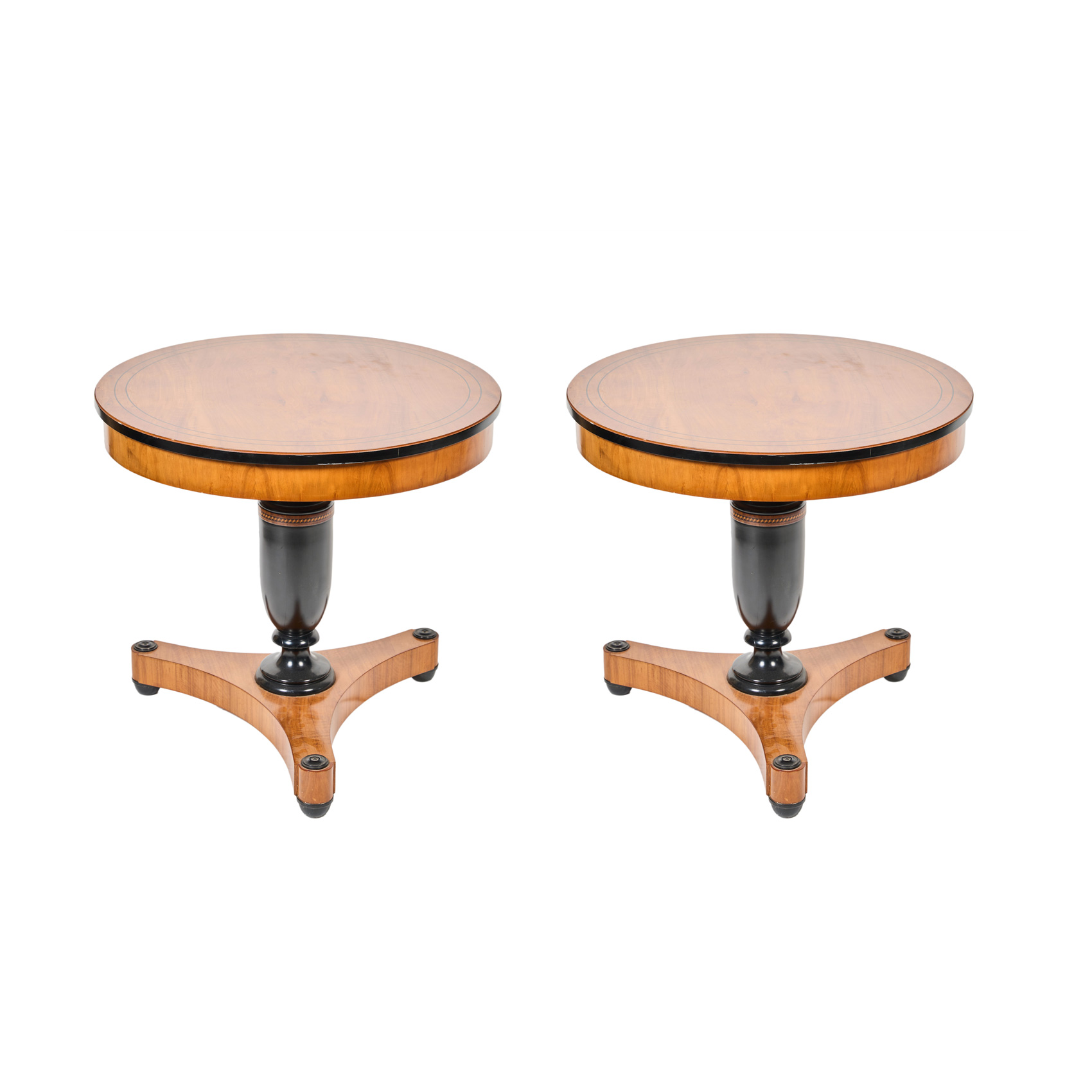 Pareja de mesas circulares estilo Biedermeier en madera de cerezo con pie de trípode y fileteado en madera ebonizada en el sobre, s.XX. Pie en madera ebonizada con cenefa geométrica de marqueterias.