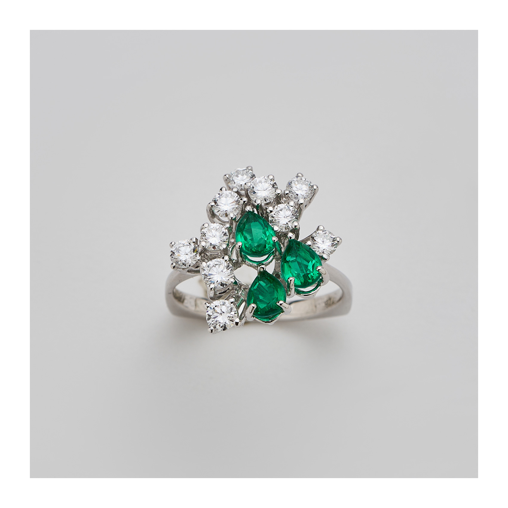 Sortija en oro blanco con diamantes talla brillante y esmeraldas colombianas talla perilla engastados en garras.