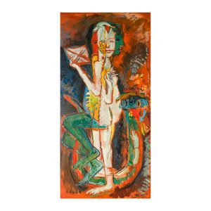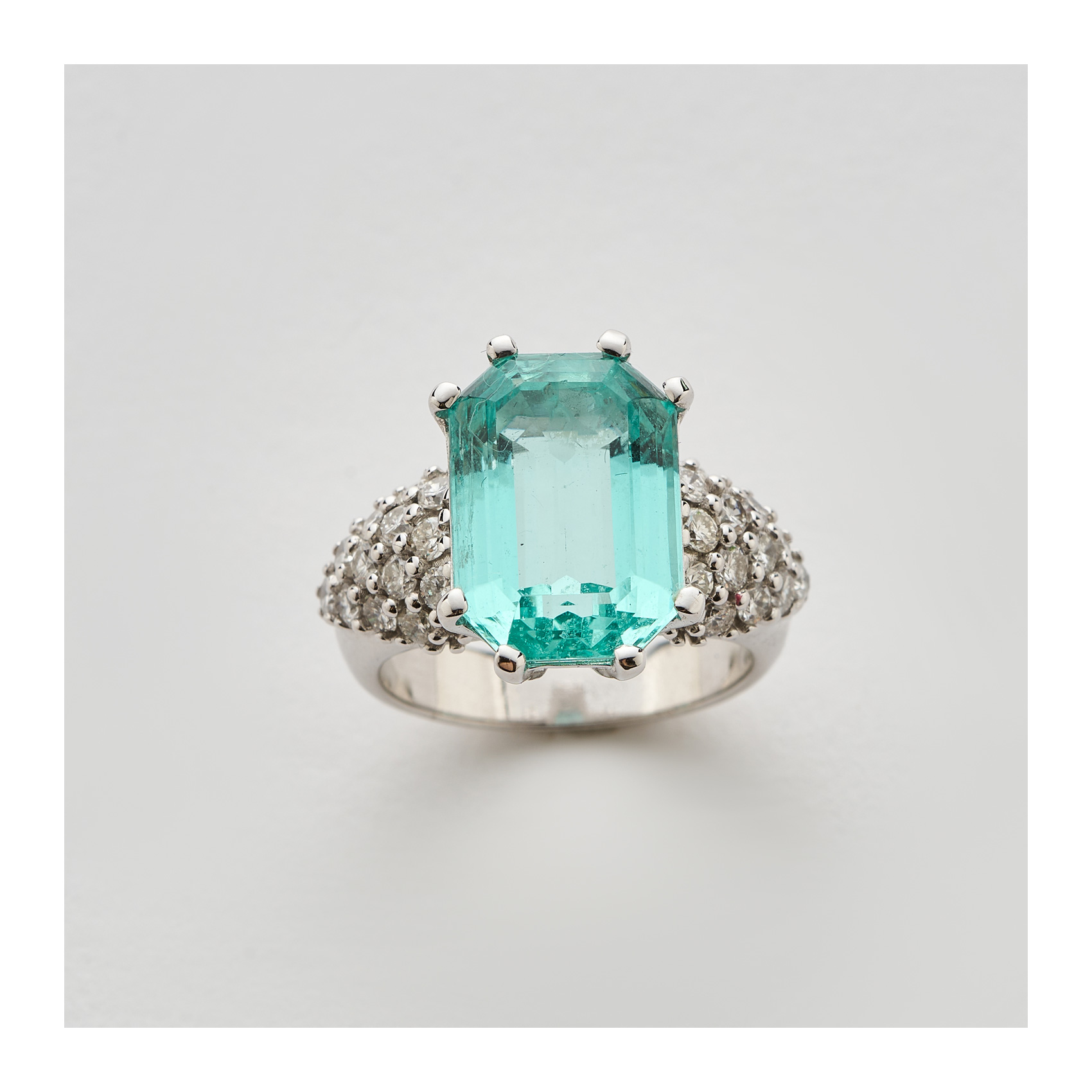 Sortija en oro blanco con esmeralda talla octogonal custodiada por diamantes talla brillante engastados en garras.