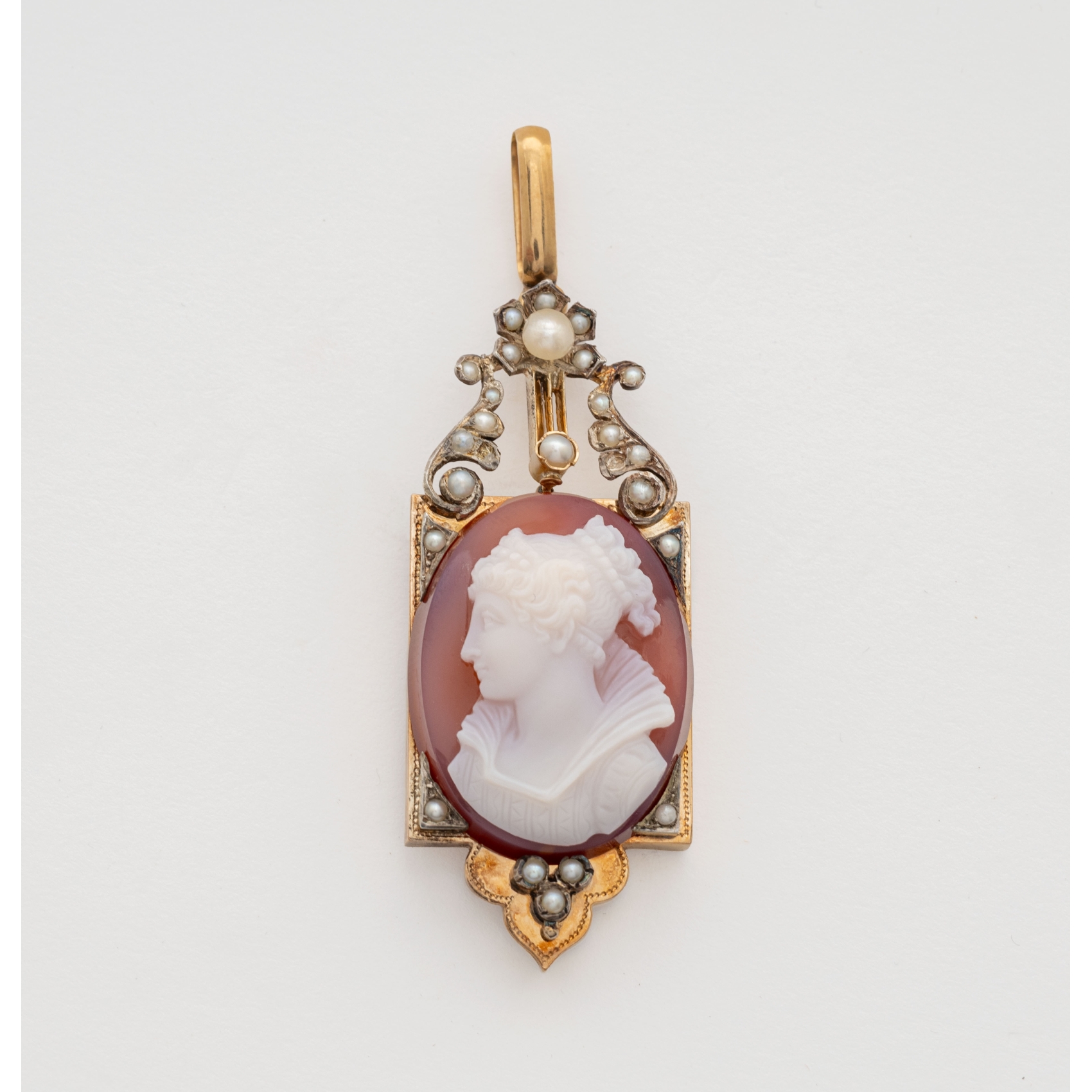 Colgante estilo victoriano en oro y vistas en plata con perlas de aljofar y camafeo en concha representando perfil de dama, 7 x 2,5 cm.