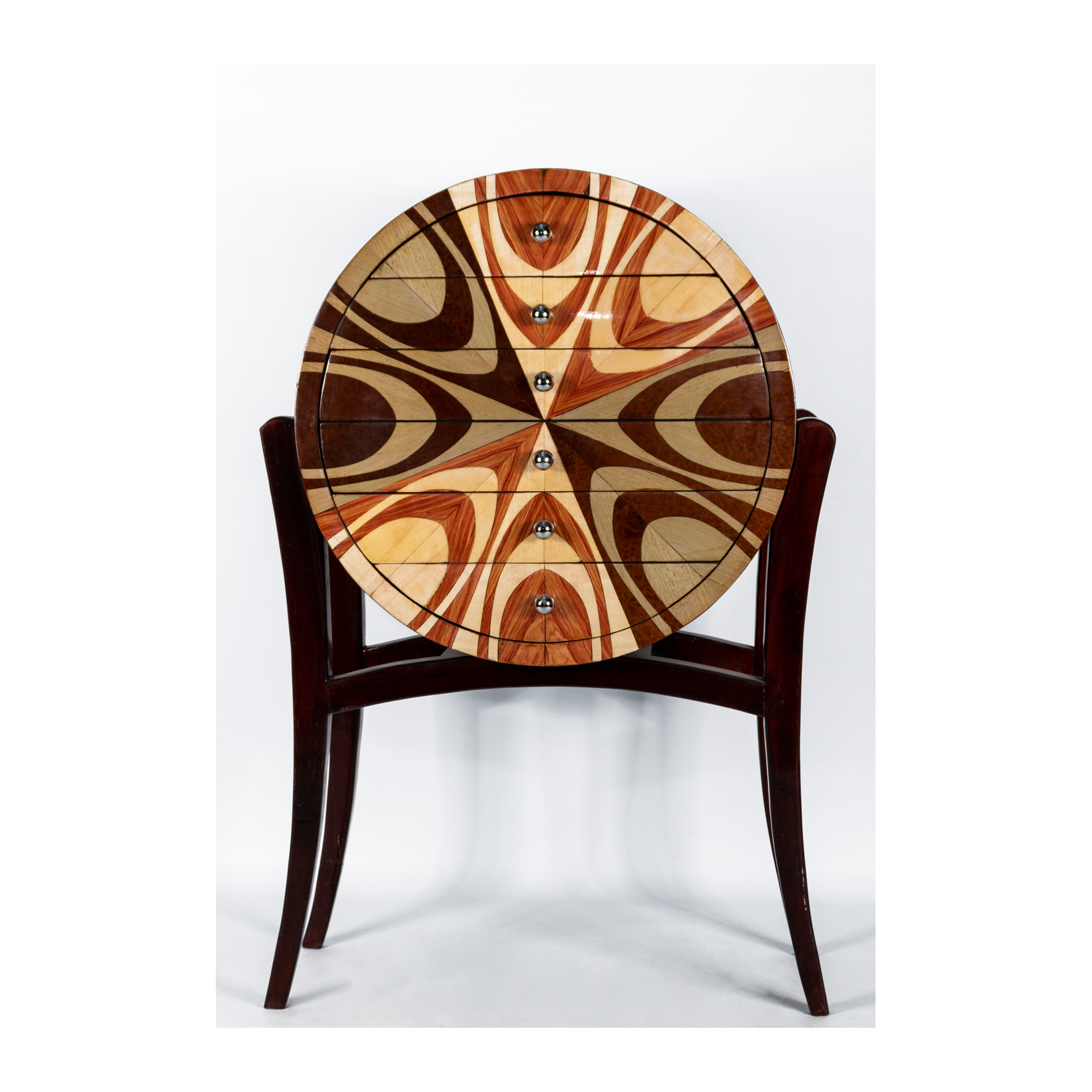 Cómoda de diseño circular estilo Mid Century con decoración geométrica en marqueterías de palosanto y olmo con seis cajones al frente, s.XX. Apoya sobre estructura de patas galveadas.