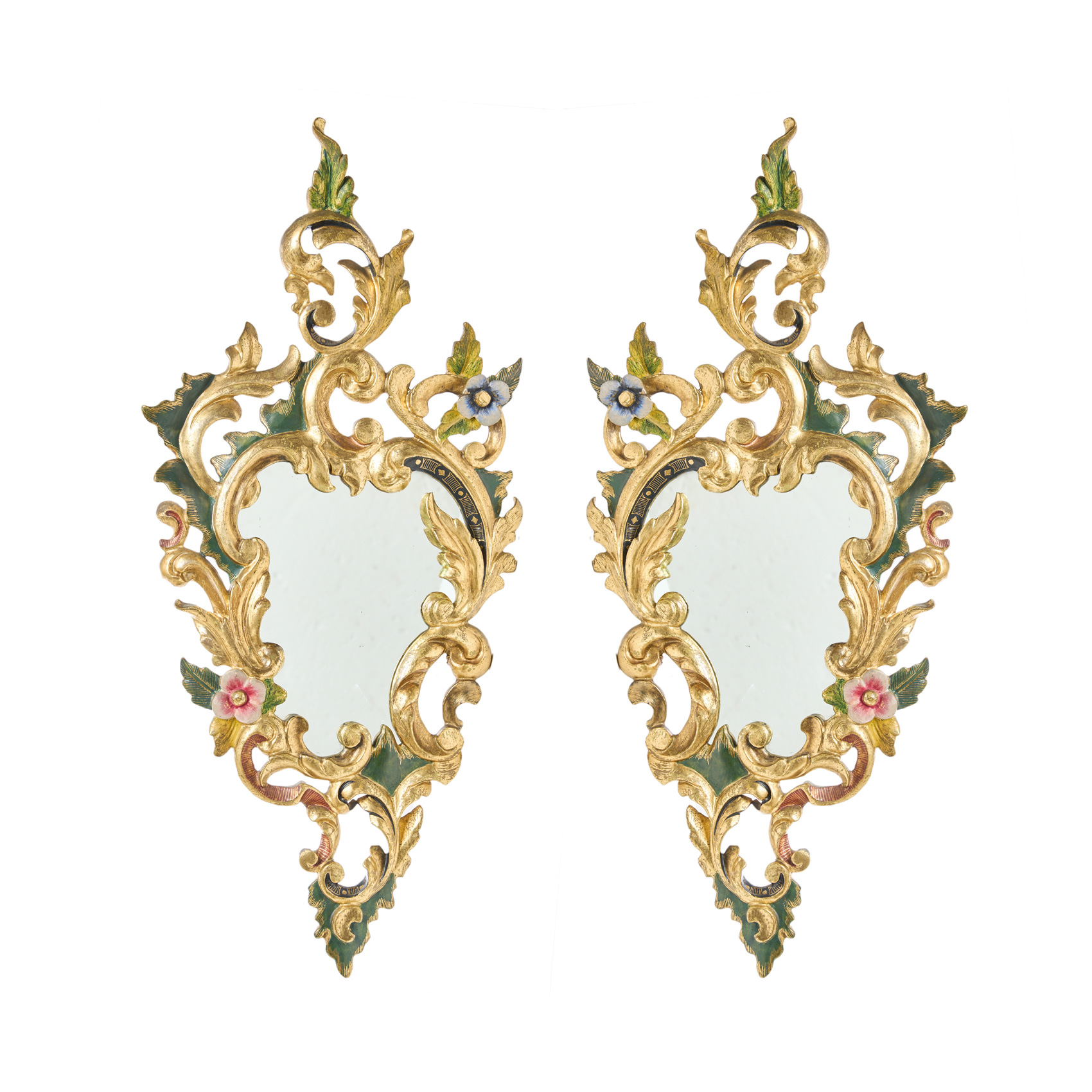 Pareja de espejos cornucopias en madera tallada, policromada y dorada con decoración de roleos, rocallas y flores, s.XX.