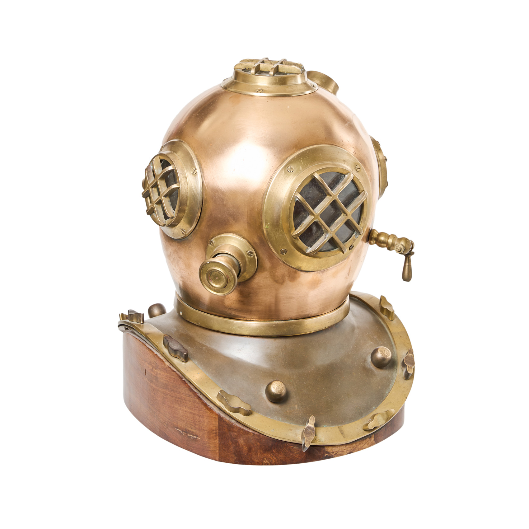 Escafandra de buzo en cobre y latón sobre peana en madera tallada, ppios. del s.XX.