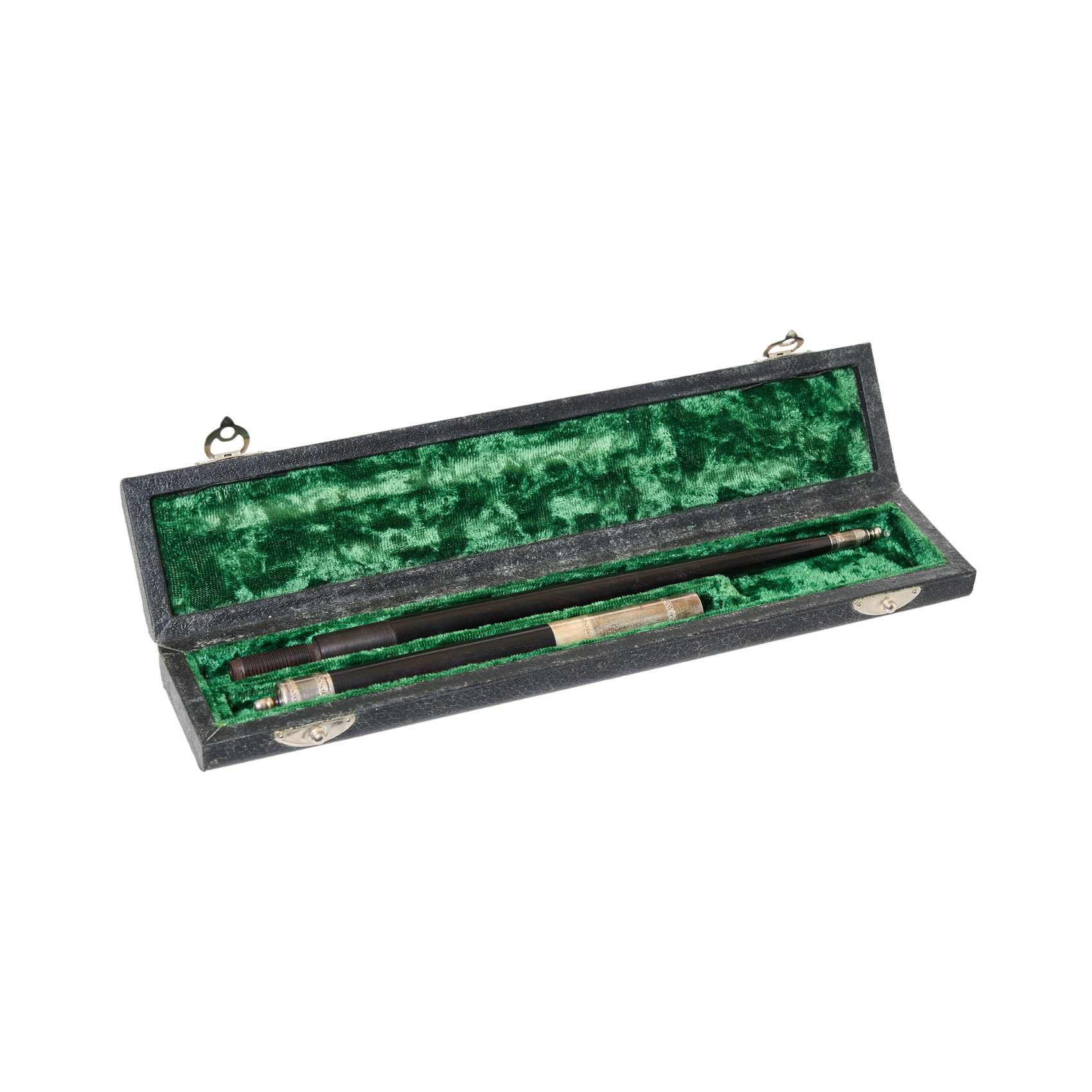 Batuta de director de orquesta en madera de ébano tallada con remates en plata punzonada. Presentada en su estuche original.