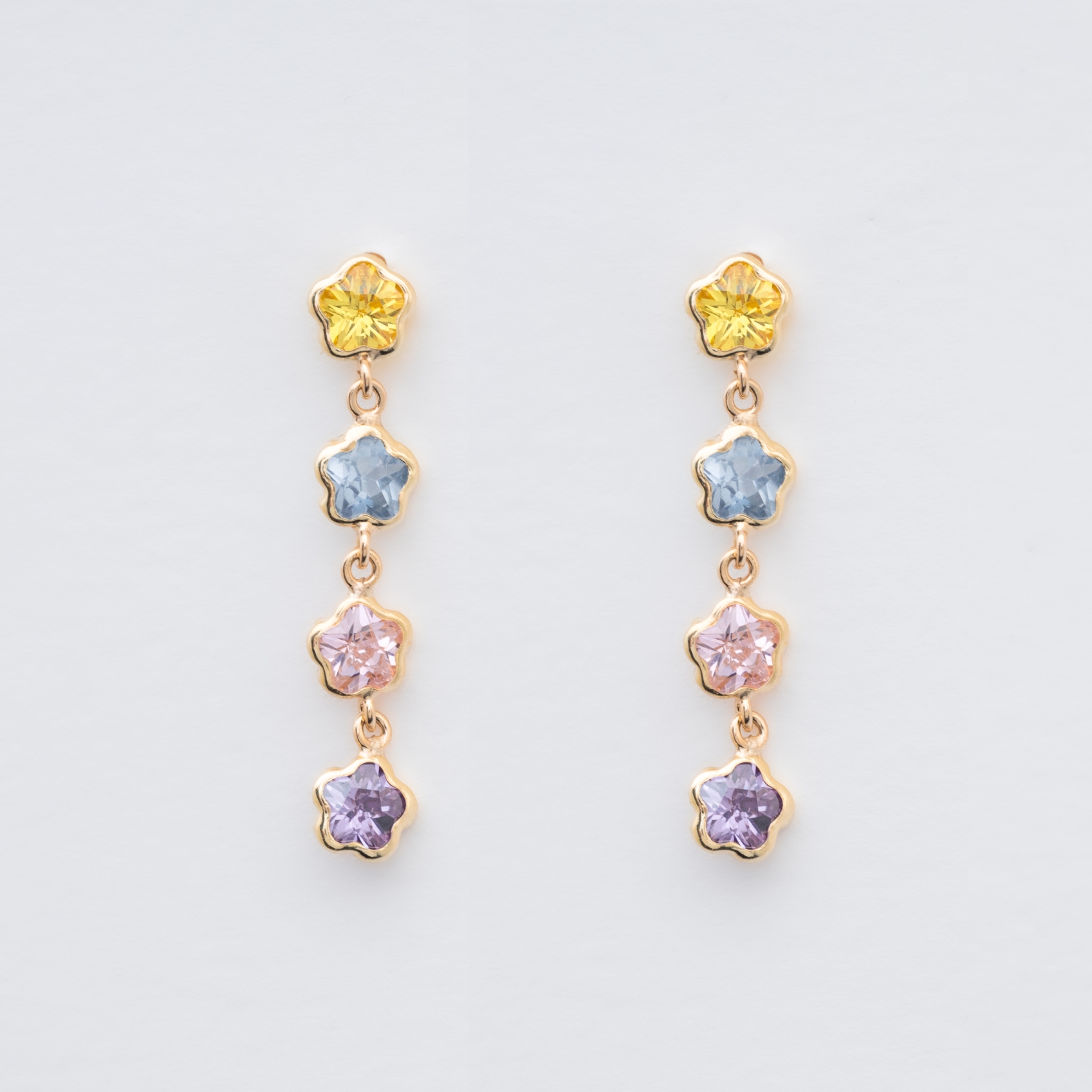 Pendientes largos en oro 9K con flores de turmalinas multicolor engastadas en chatón.